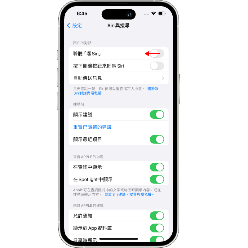 在生活中只要有聲音稍微接近「嘿Siri」的音調,就可能誤觸發Siri功能。如果不常使用「嘿Siri」,只需進入「設定」>「Siri與搜尋」,然後關閉「聆聽嘿Siri」。這樣一來,就不會再出現iPhone隨時準備接收「嘿Siri」指令的情況了,若有需要,也可使用長按側邊按鈕來呼叫Siri。