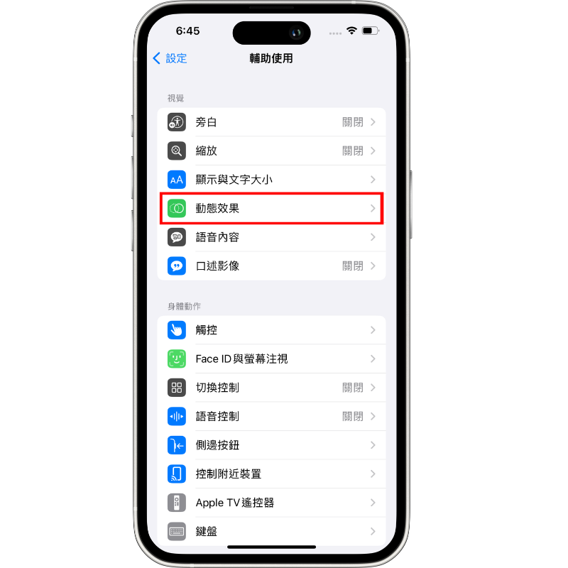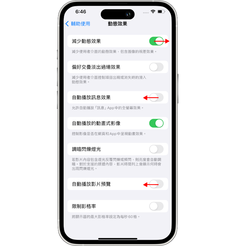 在設定中,找到「補助使用」>「動態效果」,開啟「減少動態效果」,同時關閉「自動播放訊息效果」和「自動播放影片預覽」,這樣做就能夠有效提升電池續航功能啦。