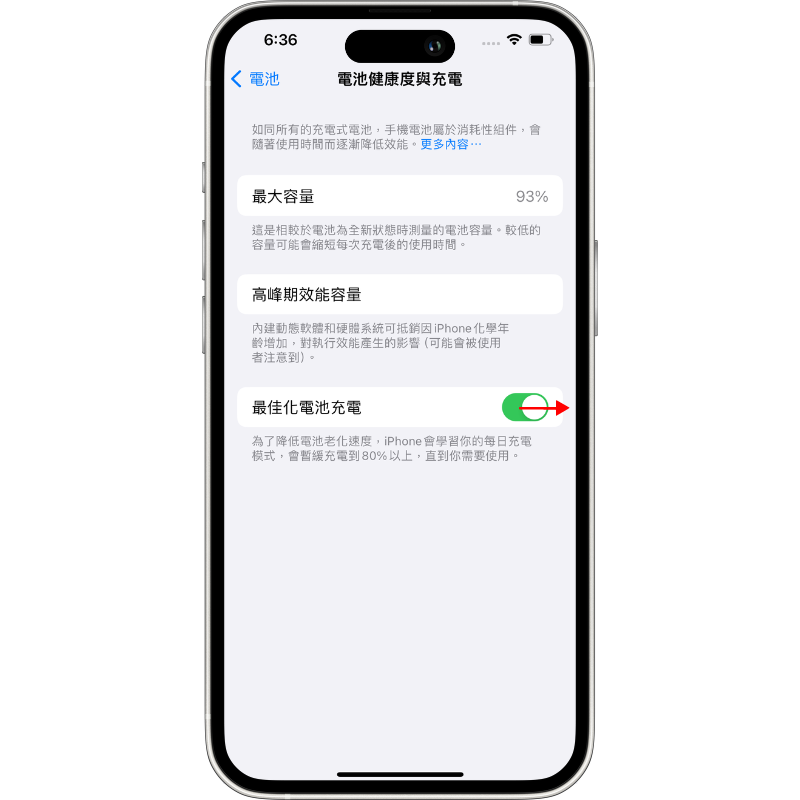 晚上睡覺時最好不要讓 iPhone 充電一直保持在100%。反覆充放電會加速電池老化。若你習慣晚上充電,可開啟「最佳化電池充電」功能,有助減緩電池老化速度,延長電池壽命。