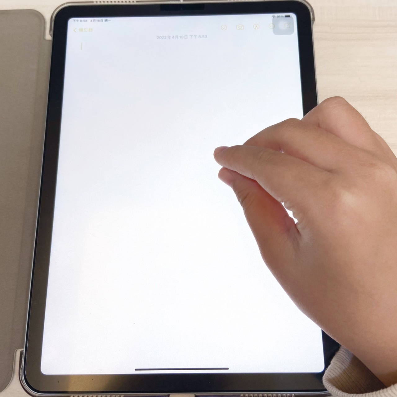 第二步:打開iPad記事本或是其他APP(例如:訊息、FB或LINE),並且用三指快速往外滑動即可貼上照片。