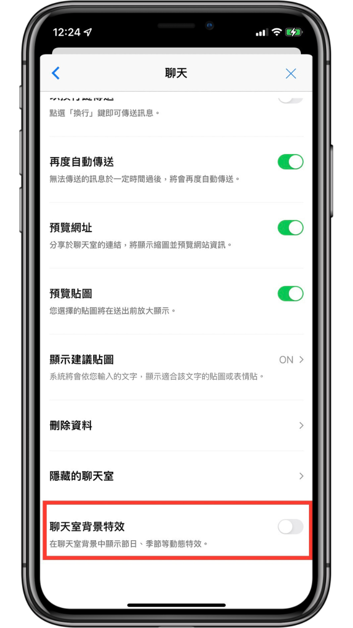開啟 LINE APP -> 到主頁分頁點選右上角「設定」-> 下滑找到「聊天」並點選 -> 滑到最底將「聊天室背景特效」關閉即可。