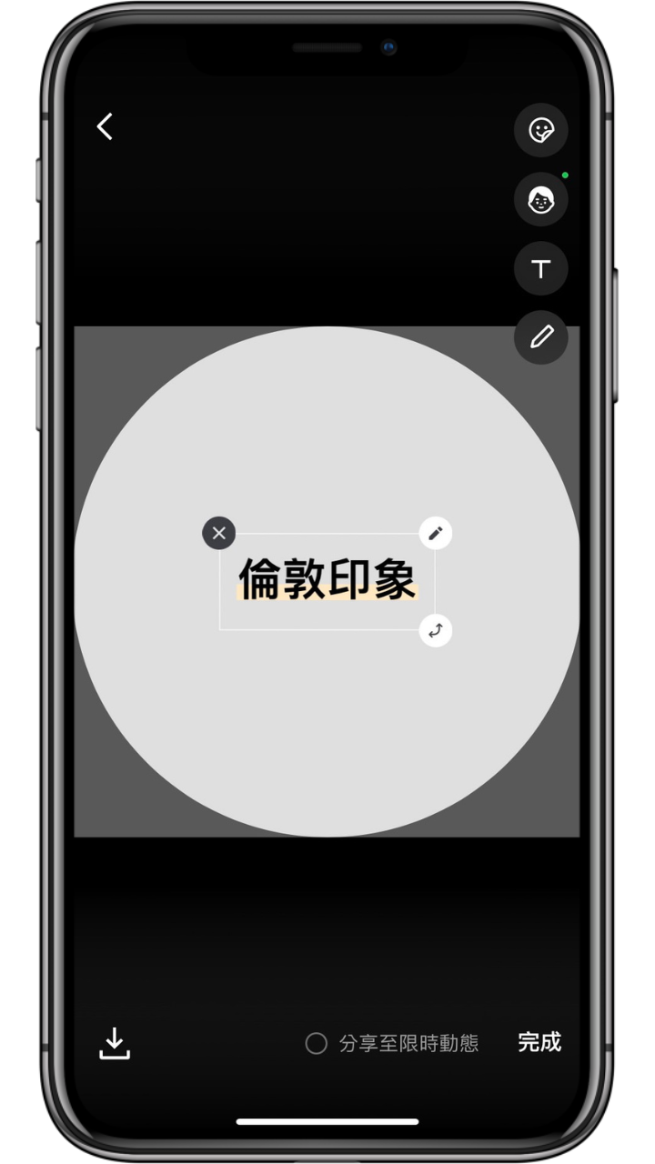 輸入完畢後點擊下方「->」圖示 -> 就可以更改字的大小或是位置,調整完後點擊右下角「完成」即可。