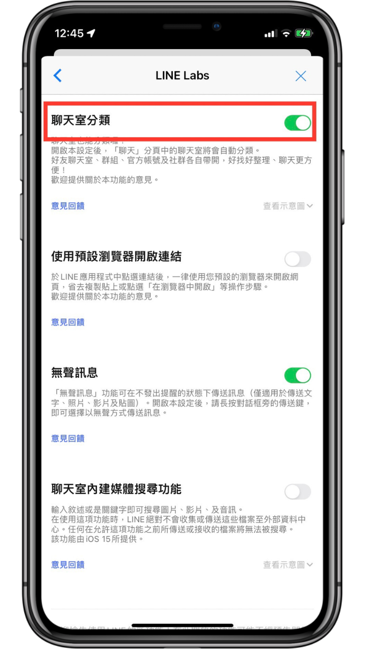 開啟 LINE APP -> 到主頁分頁點選右上角「設定」-> 下滑找到「LINE Labs」並點擊 -> 將「聊天室分類」開啟,這樣在聊天頁面上方就會出現五種分類標籤,後續要找聊天室就會更加方便。