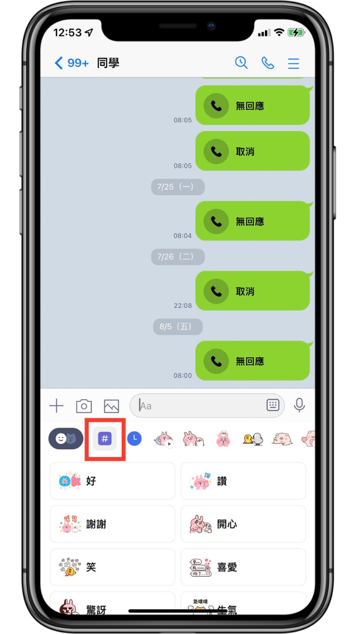 如果 LINE 貼圖太多的話,想要找某個貼圖可能就會找很久,其實 LINE 有一個內建「#」貼圖分類的功能,裡面會自動將貼圖分類成不同情緒的分類,例如:笑、驚訝、生氣等等,這樣要尋找特定情緒的貼圖也更加地容易。