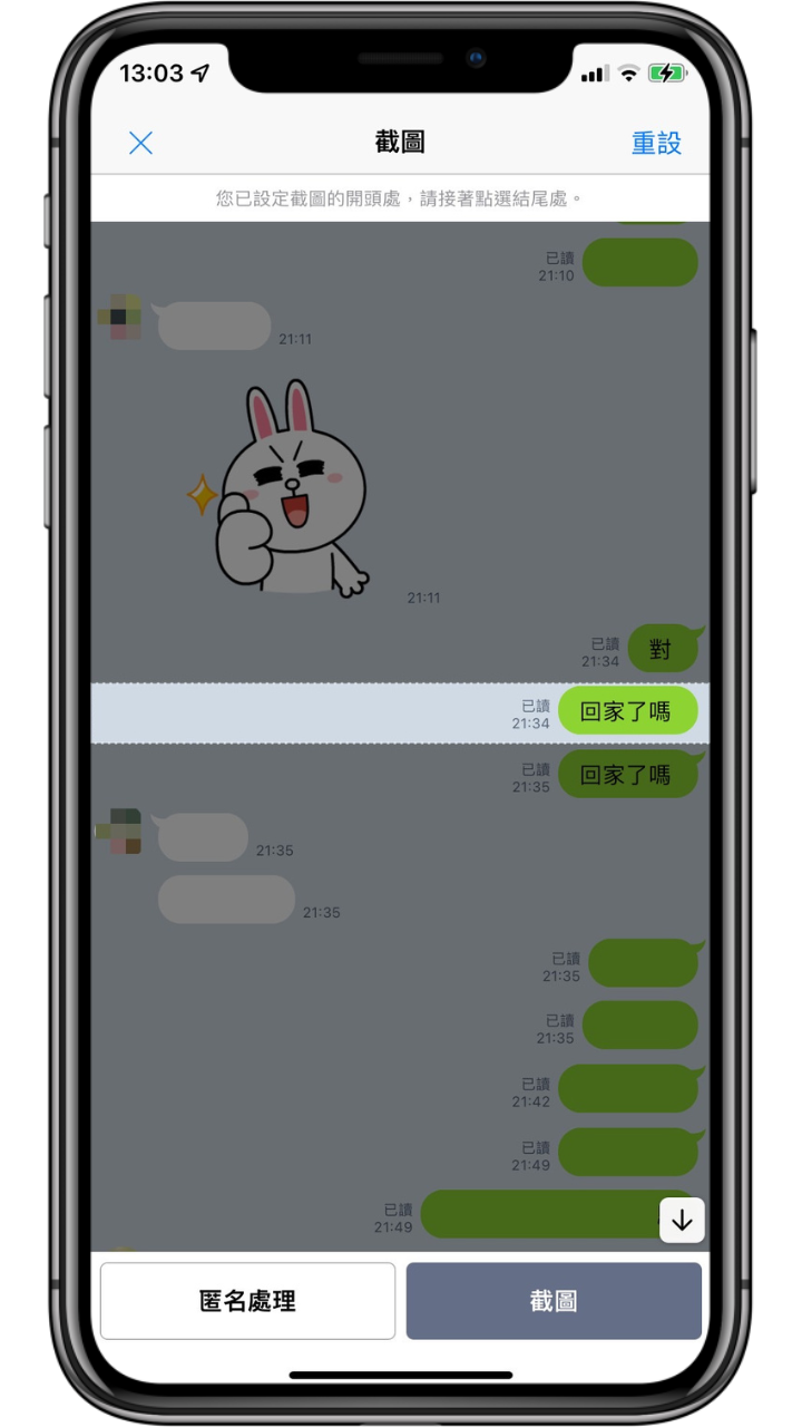 如果想要匿名截圖的話,就可以點選左下角「匿名處理」,它就會自動將對方的大頭貼換成 LINE 隨機的頭貼,如果是群組的話,名字也會更改。
