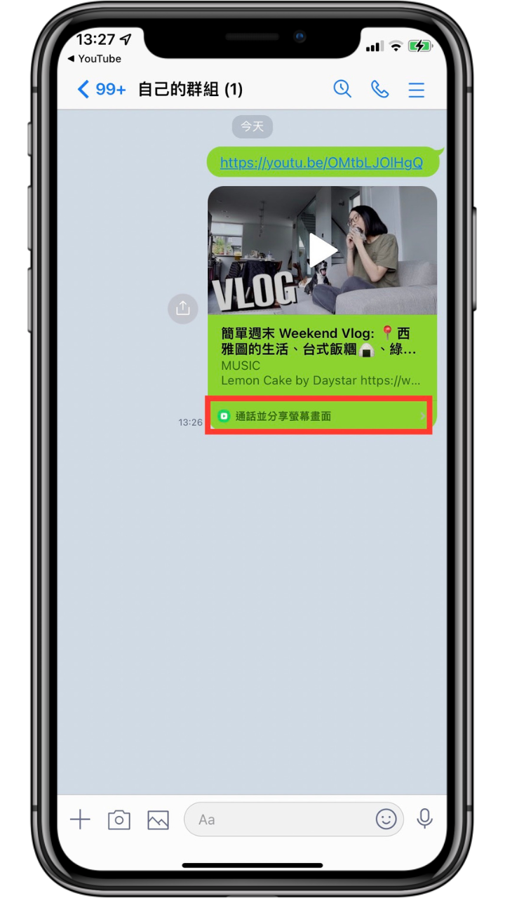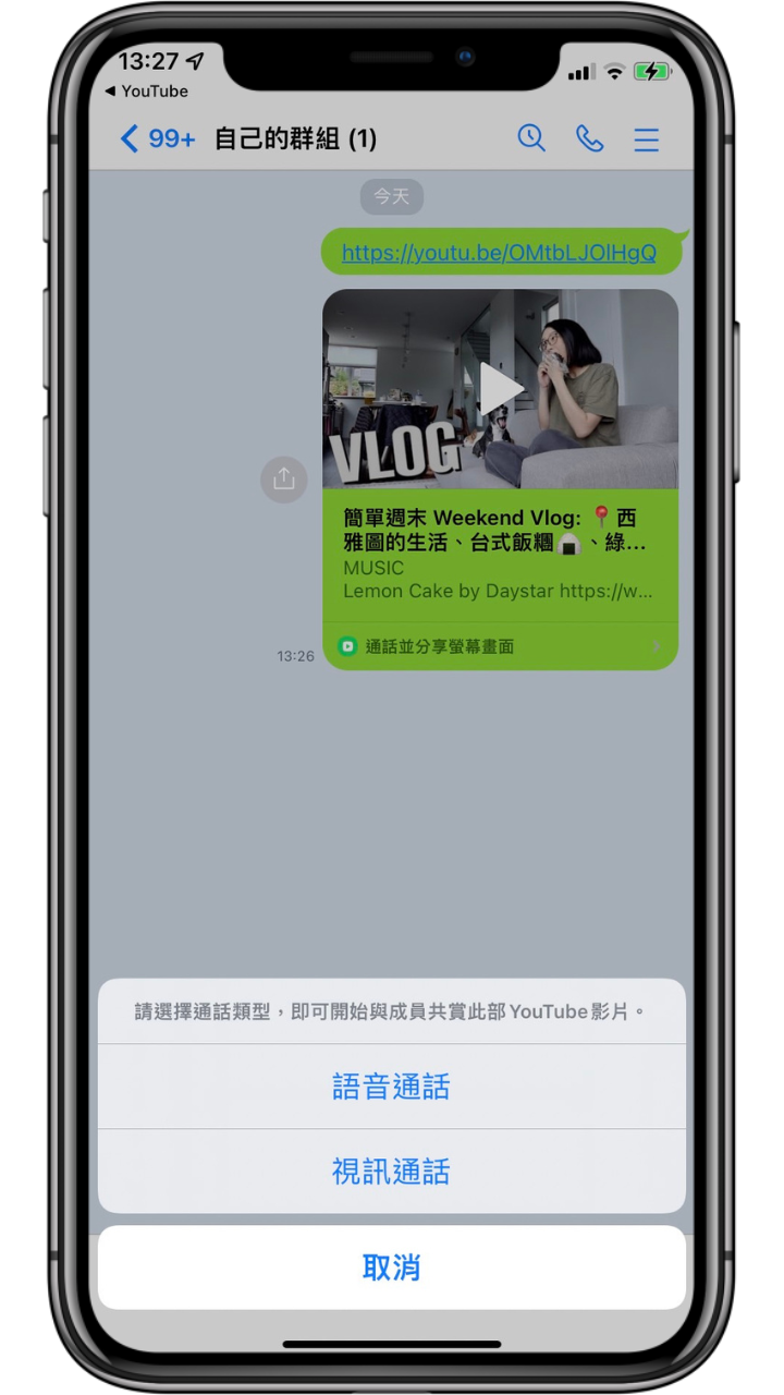先將 Youtube 網址傳到群組聊天室,打開群組聊天室後點選網址下方的「通話並分享螢幕畫面」,並且選擇通話模式。