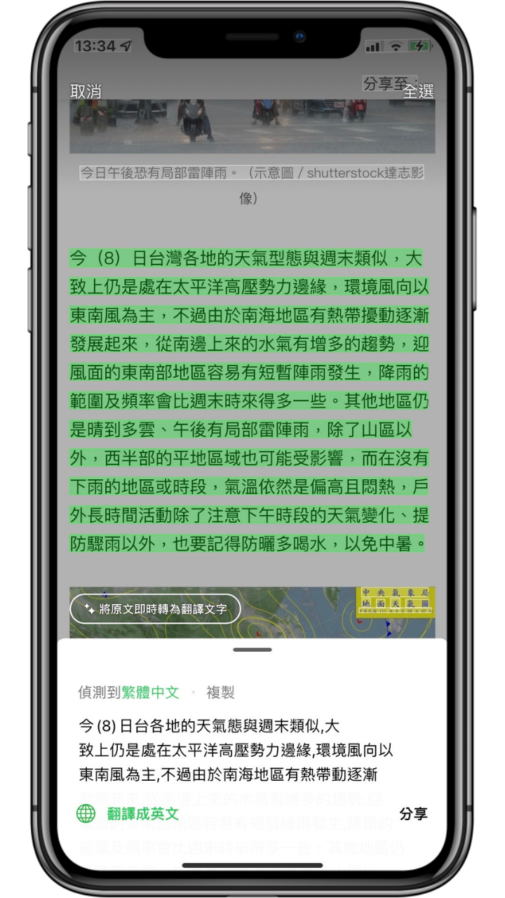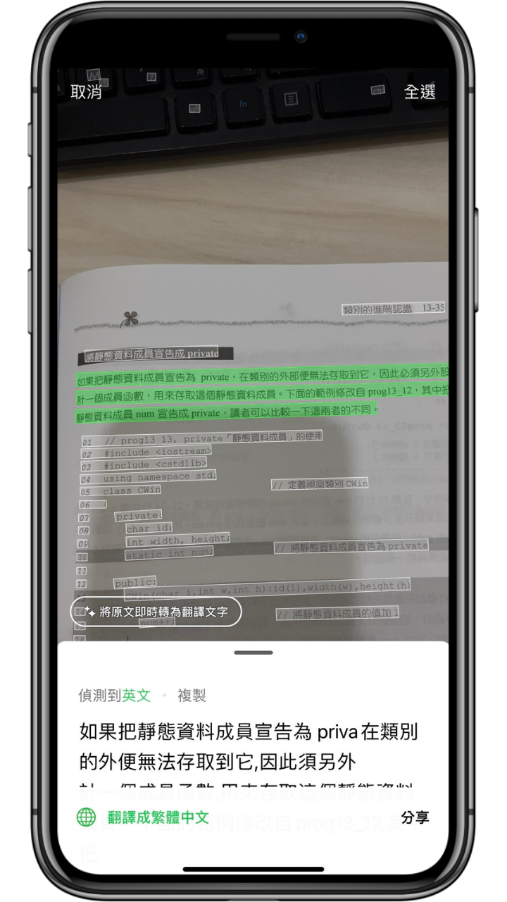 接下來就會出現掃描過後的文字,可以自己選擇所要轉換的範圍,下方就會出現轉換後的文字,就可以將文字複製分享給他人。