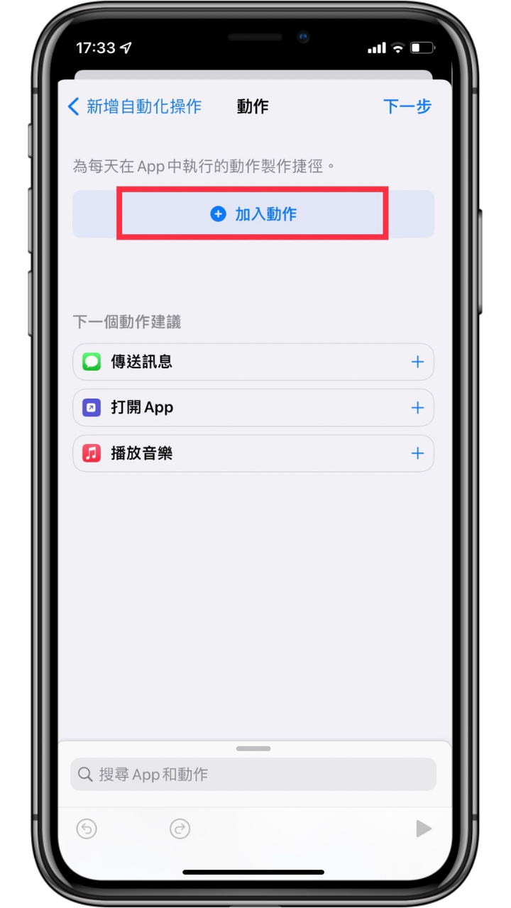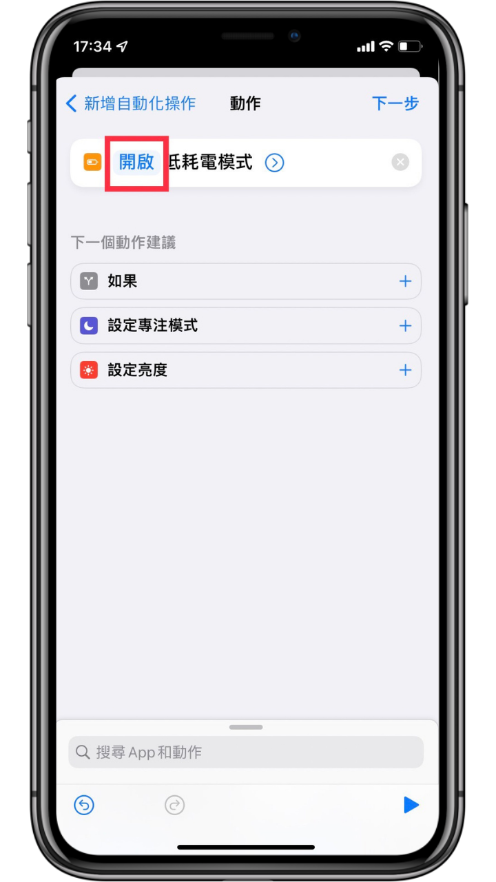點擊「加入動作」-> 搜尋「低耗電模式」並點擊「設定低耗電模式」。