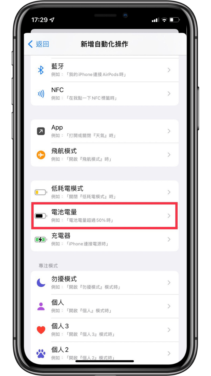 雖然 iOS 系統在設備電量低於 20% 時會自動開啟「低耗電模式」,但是這個時候電量其實已經有點過低了,所以我們可以利用自動化功能,在電量還剩多一點時,就先開啟「低耗電模式」,這樣除了可以提早提醒使用者設備快沒電之外,也能延長多一點的使用時間。
