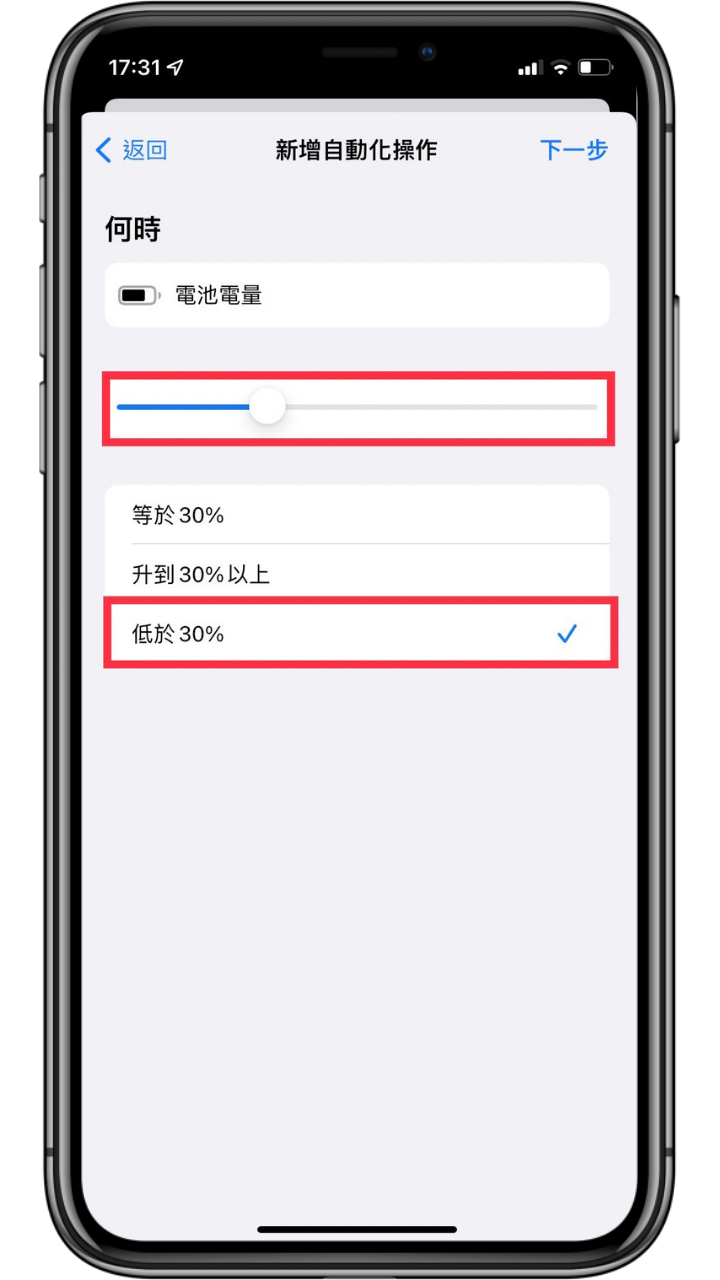 下滑找到「電池電量」-> 調整中間滑桿選擇想要開啟低耗電模式的電量,並且勾選「低於XX%」-> 設定完成後點選右上角「下一步」。