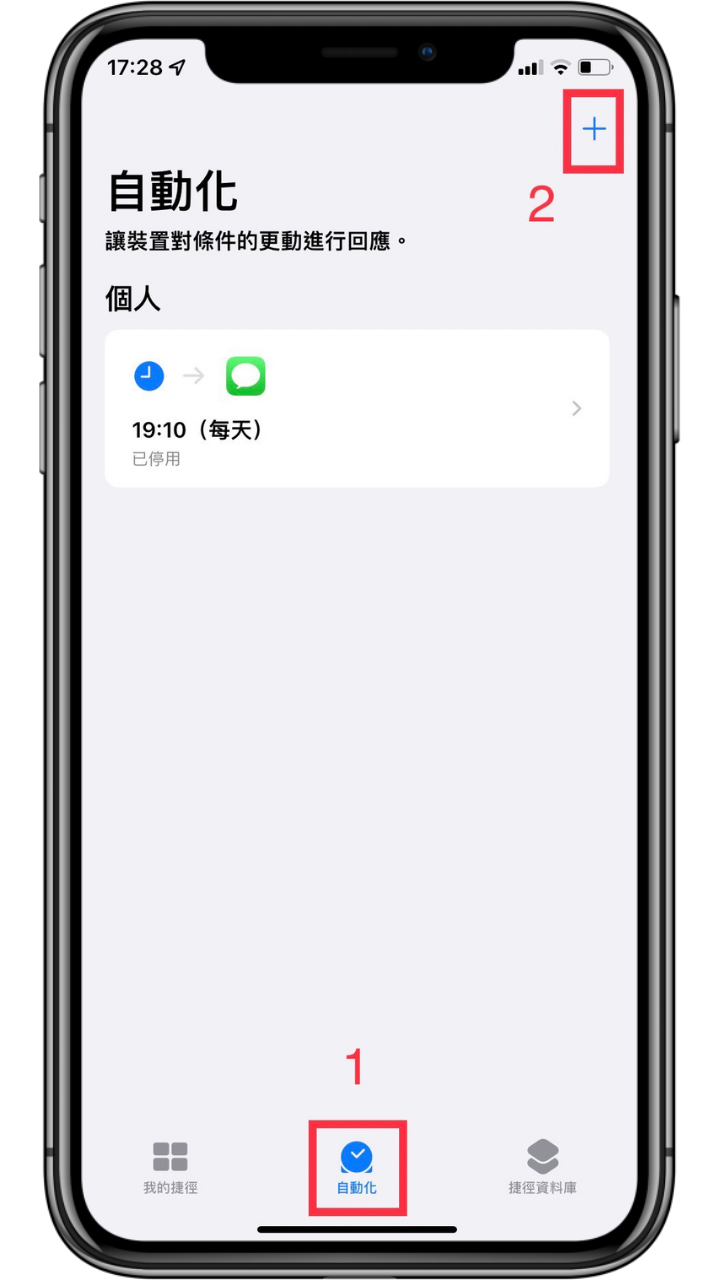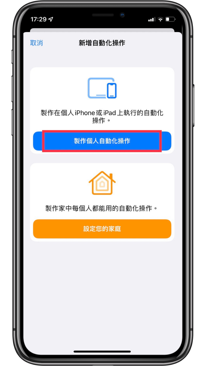 開啟「捷徑」APP -> 切換「自動化頁面」-> 點擊右上方「+」-> 點選「製作個人自動化操作」。