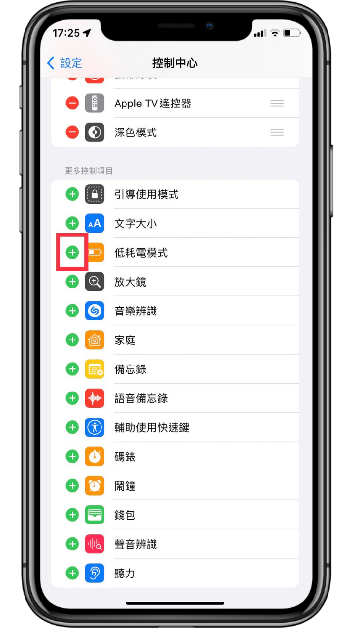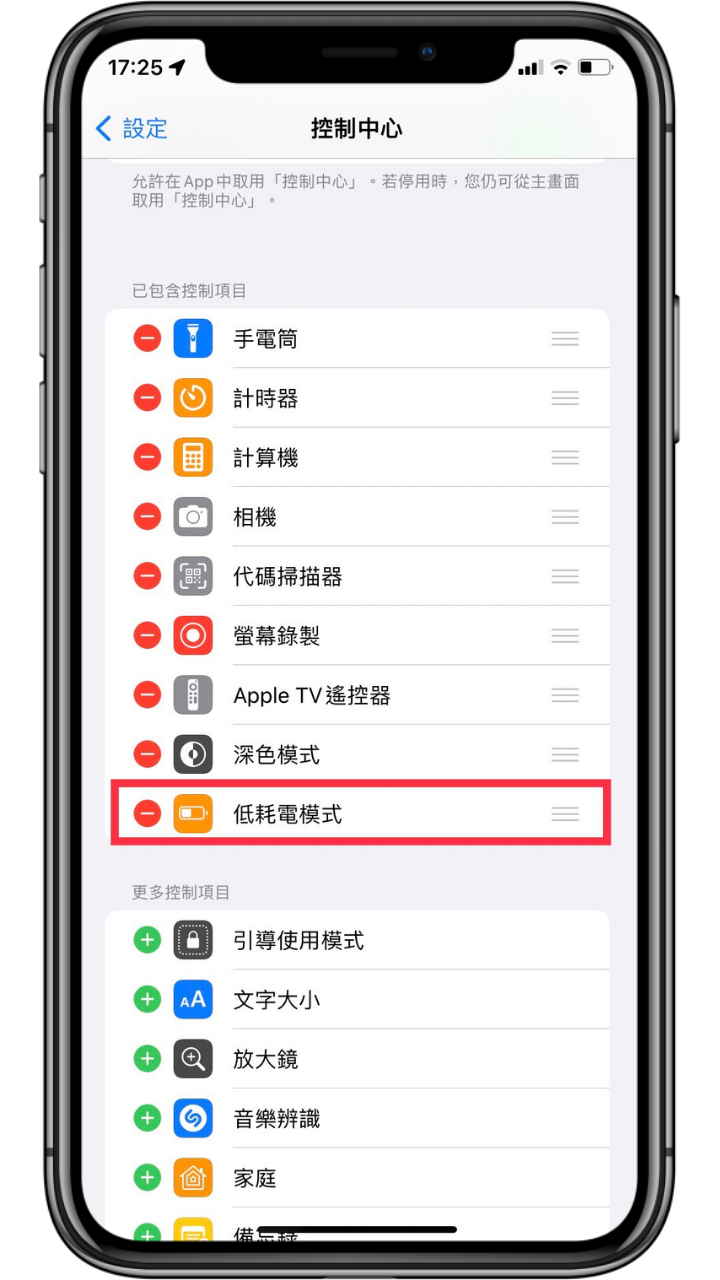 如果控制中心找不到開啟低耗電模式功能的話,可到iOS「設定」-> 點選「控制中心」,找到低耗電模式並點選左方「+」符號,即可將「低耗電模式」加入控制中心,往後要開啟「低耗電模式」只要拉開控制中心即可。