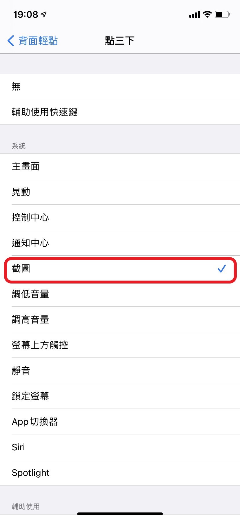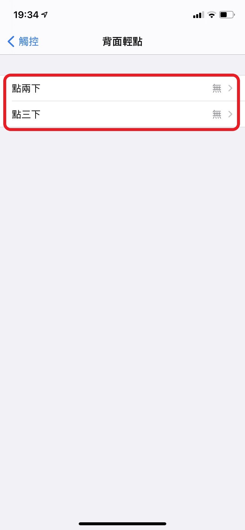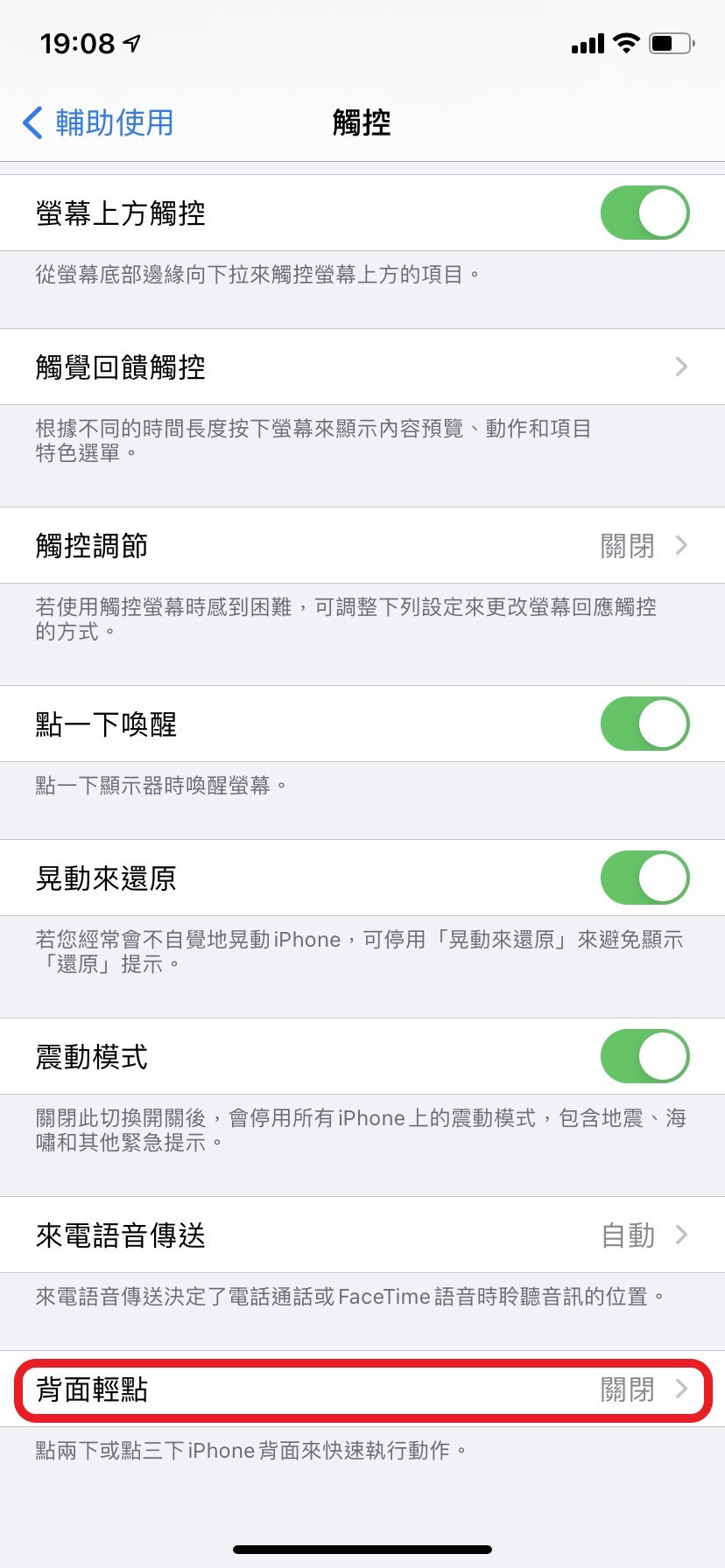 開啟方法:「設定」->「輔助使用」->「觸控」->滑到底點選「背面輕點」