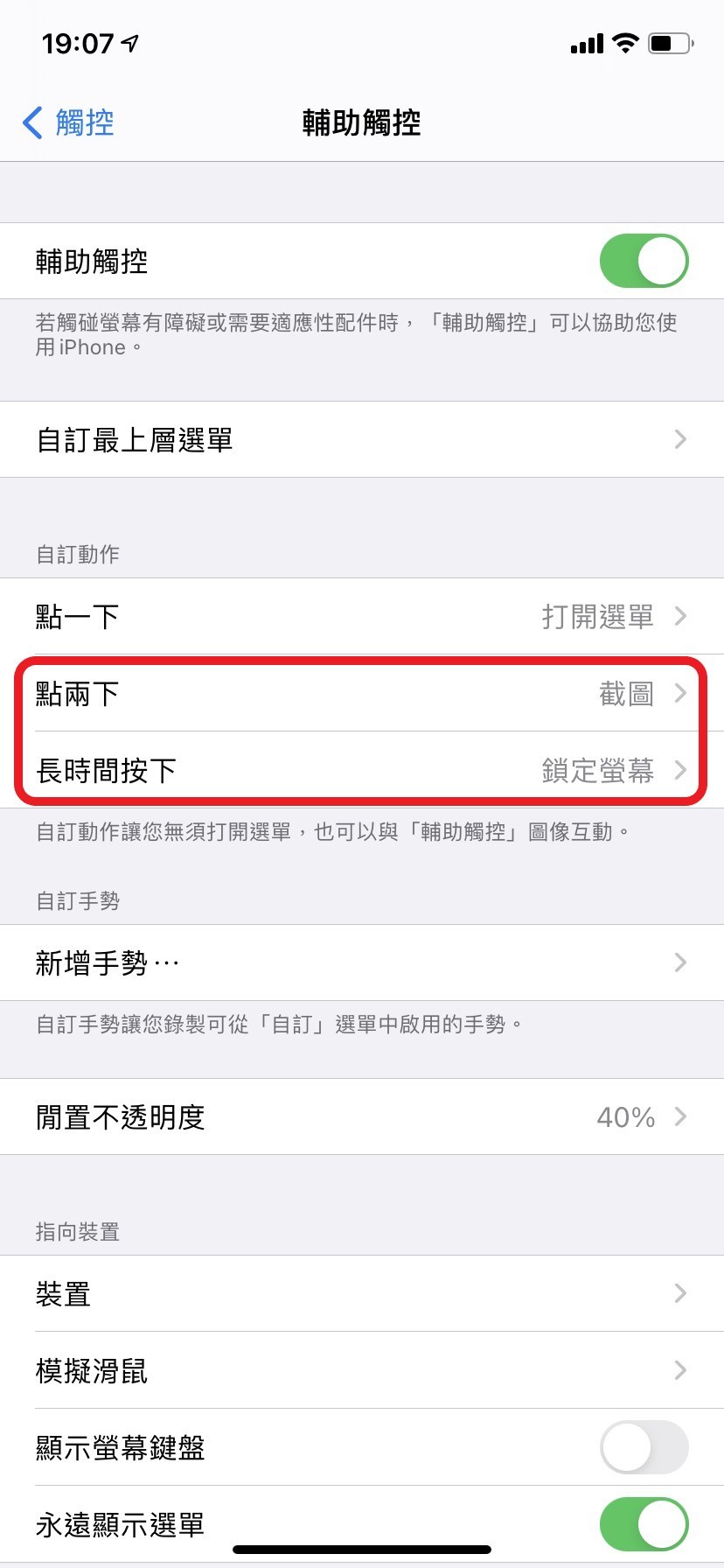 進到「輔助觸控」葉面後,下方有自訂動作,只要點選下方的選項,就可以自訂想要的截圖方式喔小編自己則是習慣使用點二下來截圖,使用上感覺起來比較快速。