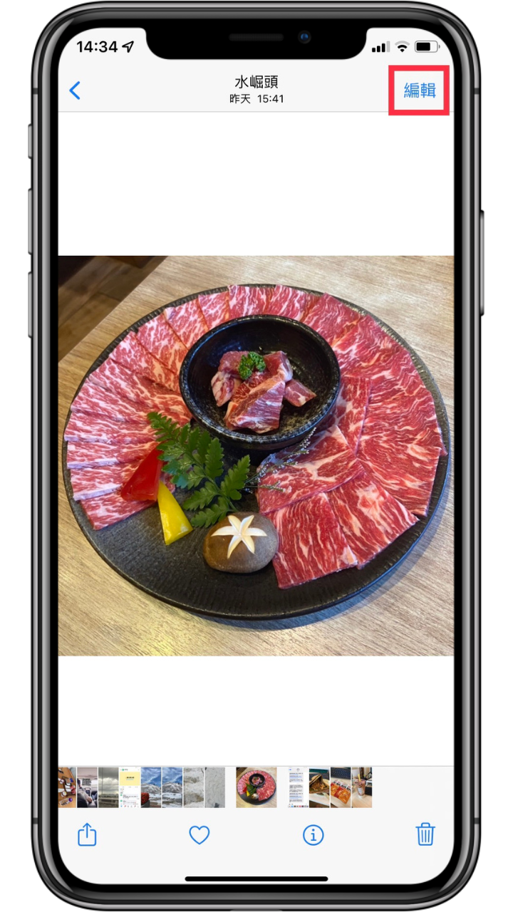 開啟「照片」APP,並且點開想要修圖的照片 -> 點擊右上角「編輯」