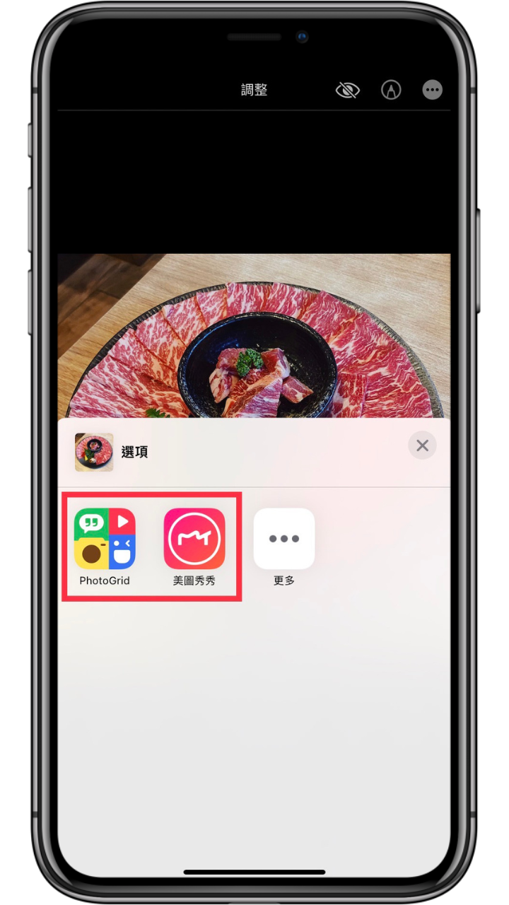 進到編輯模式後,點擊右上角「…」,就會看到自己手機有下載的第三方修圖APP,既可以依照自己的需求去點選不同的APP。