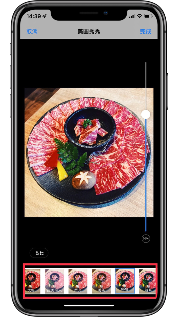 下方就可以套用不同的濾鏡,也可以針對濾鏡效果去修改數值,設定完成後就可以點選右上角「完成」。