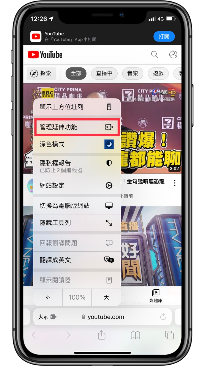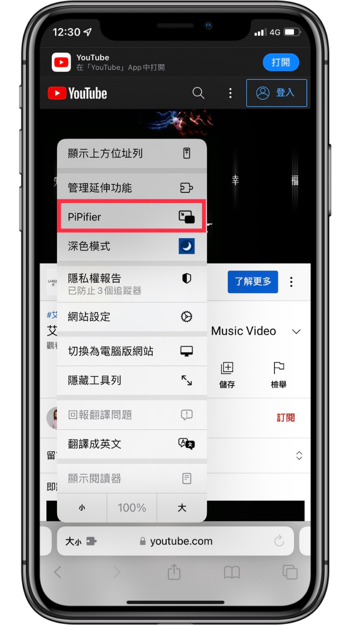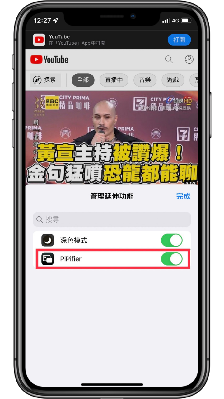 開啟 Safari 網頁 -> 點選網址列左方「大小」圖示 -> 點選「管理延伸功能」-> 將「Pipifier」開啟後點擊「完成」。