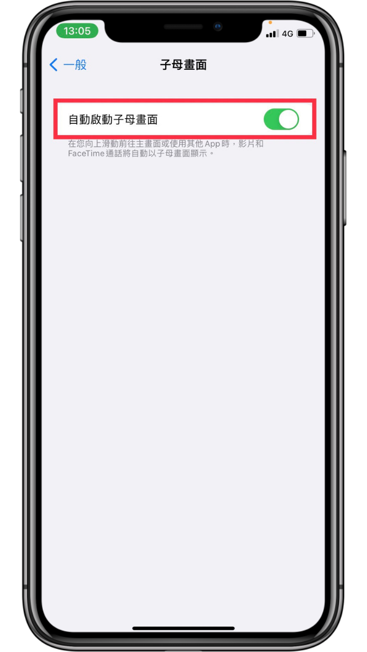開啟「設定 」,點選「一般」-> 點選「子母畫面」,並開啟「自動啟動子母畫面」。