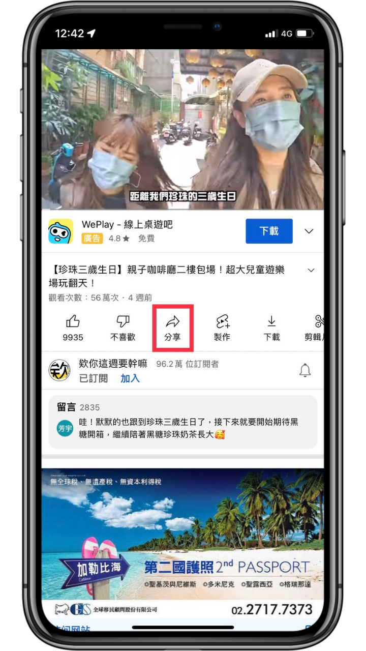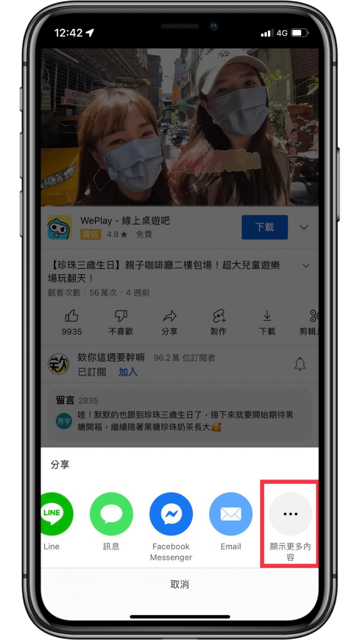 開啟 Youtube APP 上任一影片 -> 點選影片下方「分享」-> 滑至最右側點擊「顯示更多內容」。