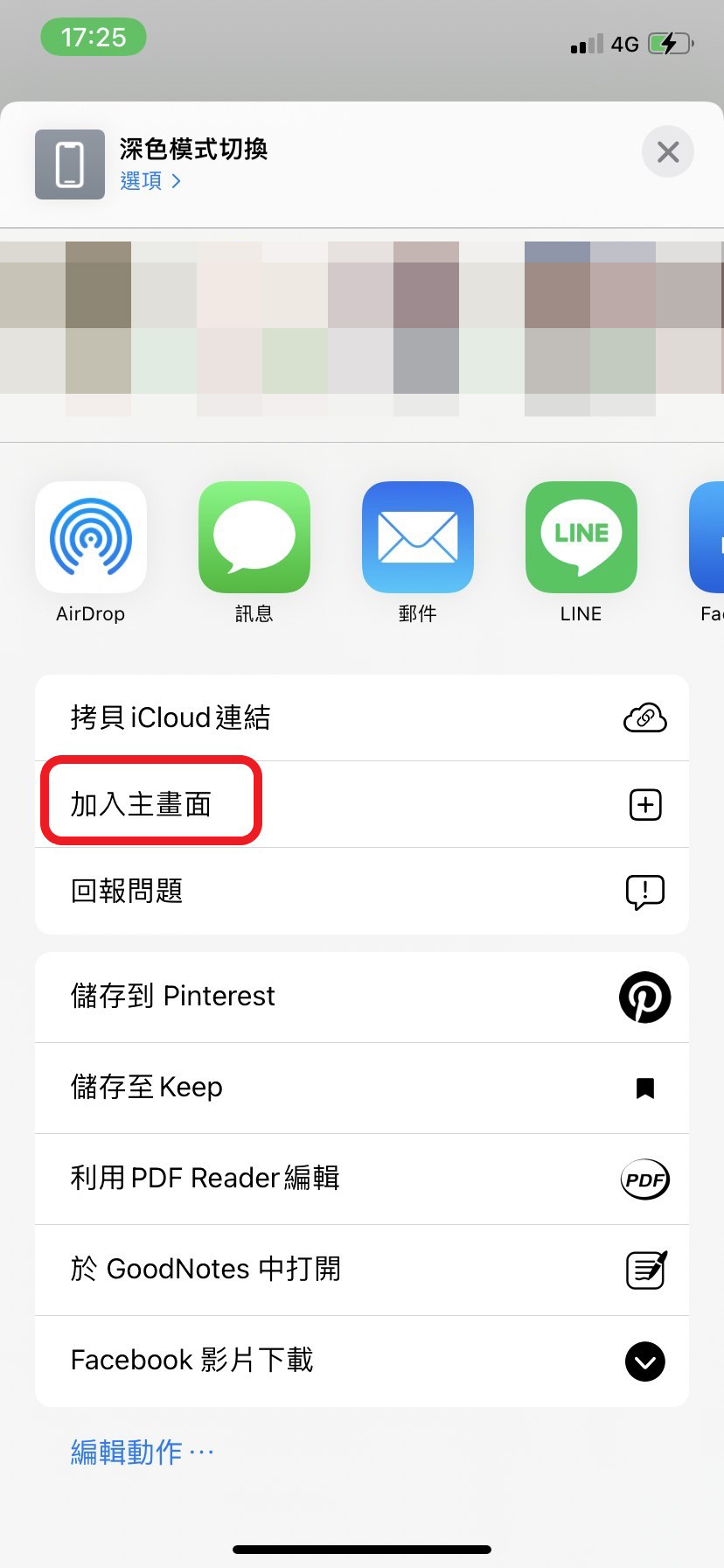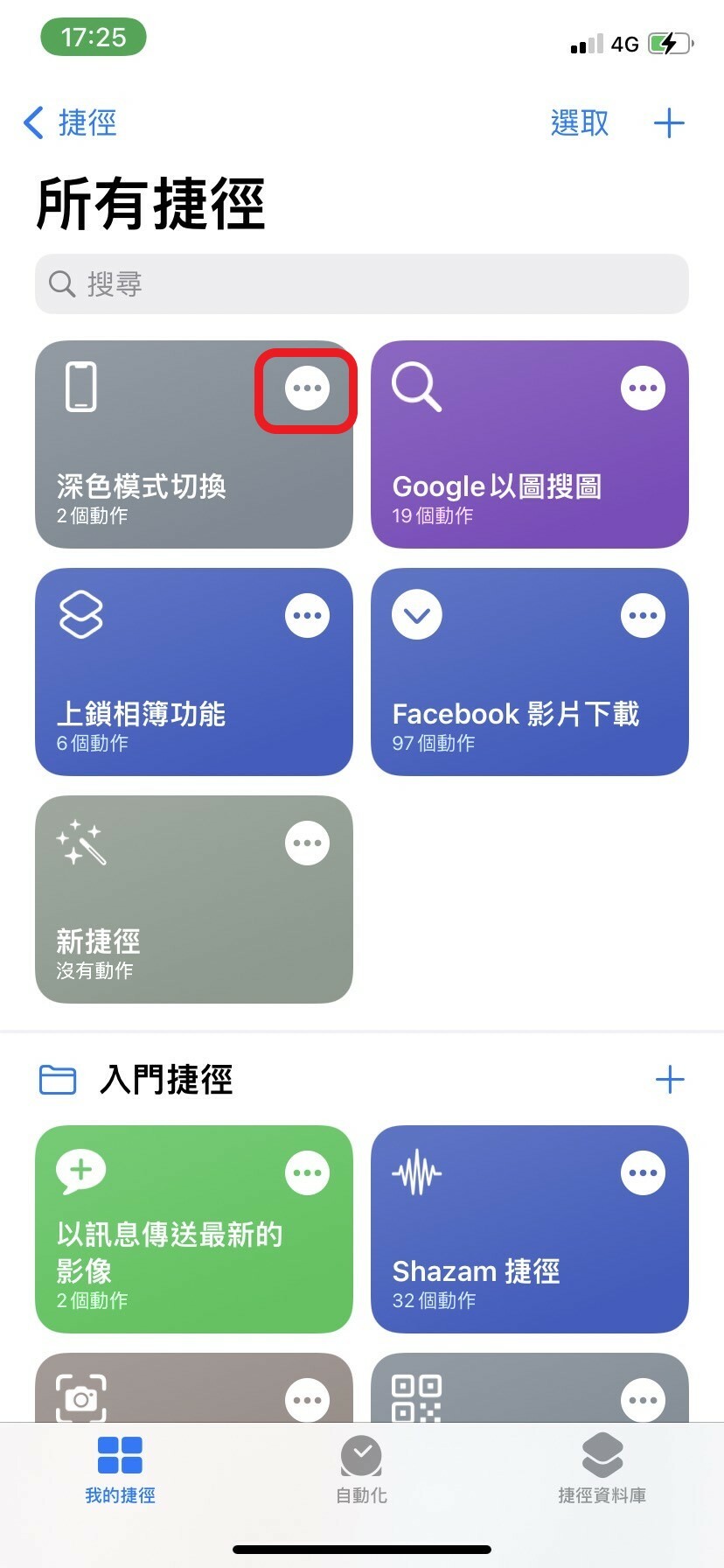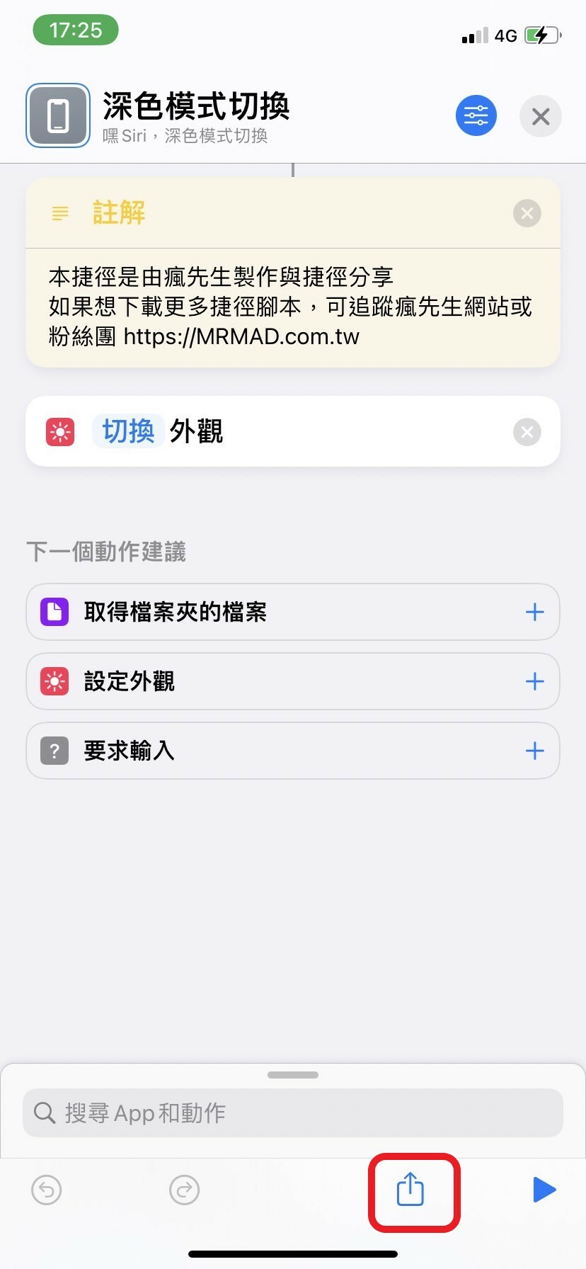 下載「深色模式切換捷徑腳本」-> 到「捷徑APP」點開「我的捷徑」找到剛剛下載的「深色模式切換捷徑腳本」點選右上角「…」-> 點選下方「分享」按鈕