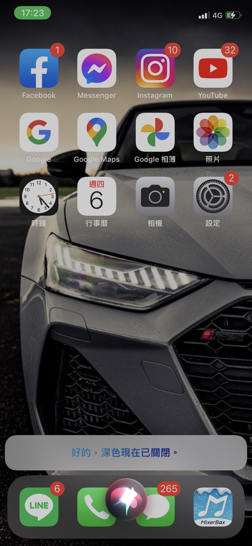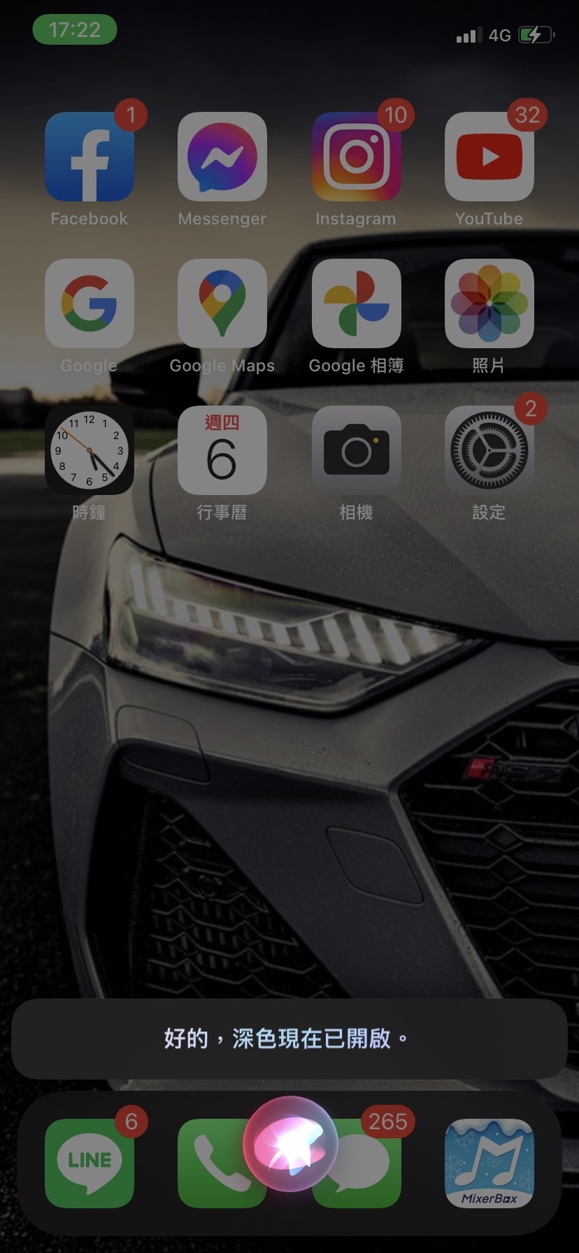 要是遇到雙手不方便時候,就可以對著手機喊「嘿~Siri」,說出「開啟深色模式」或是「關閉深色模式」也可以快速切換「淺色/深色模式」喔!