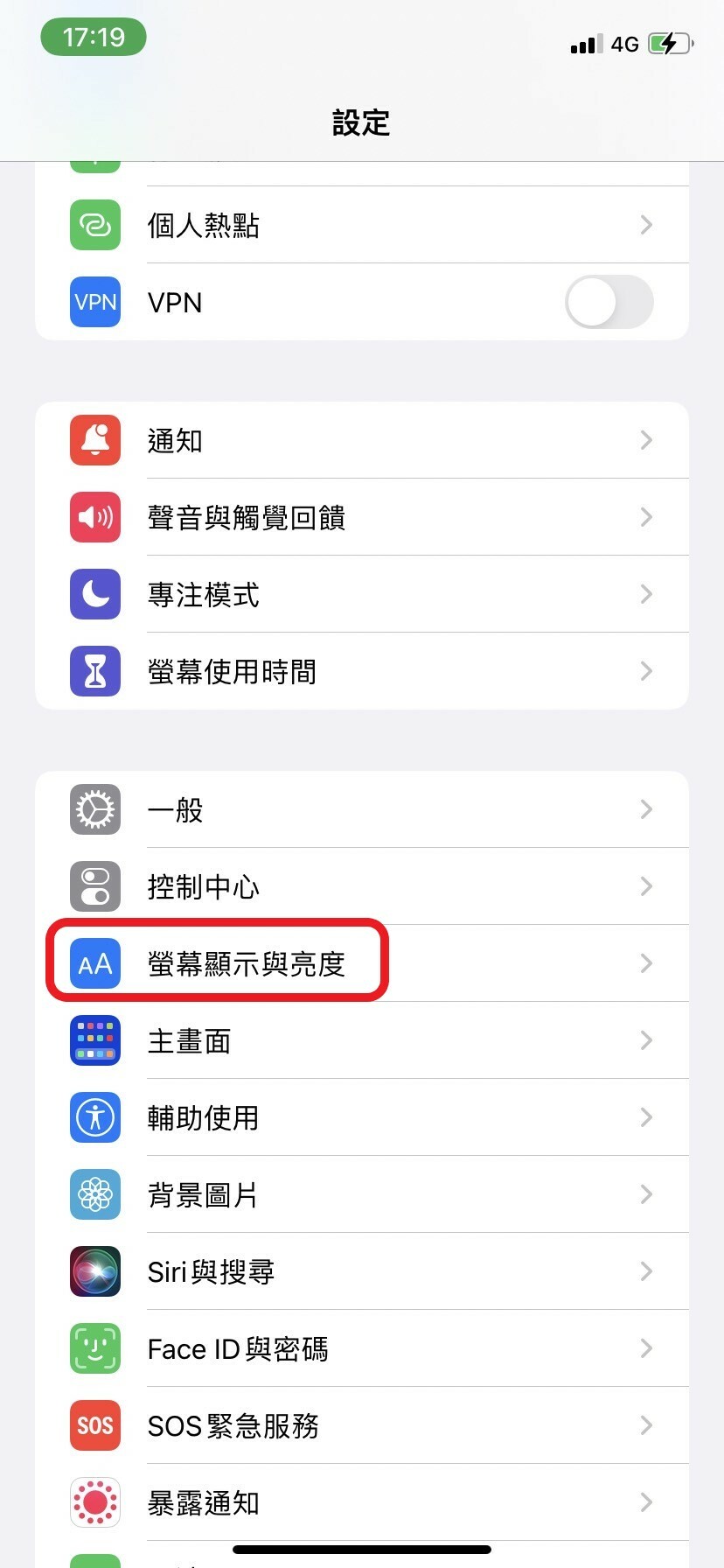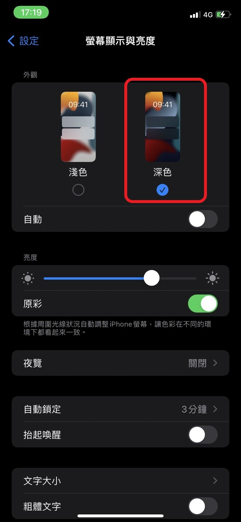 開啟「設定」-> 點選「螢幕顯示與亮度」-> 勾選「深色」,即可開啟深色模式。