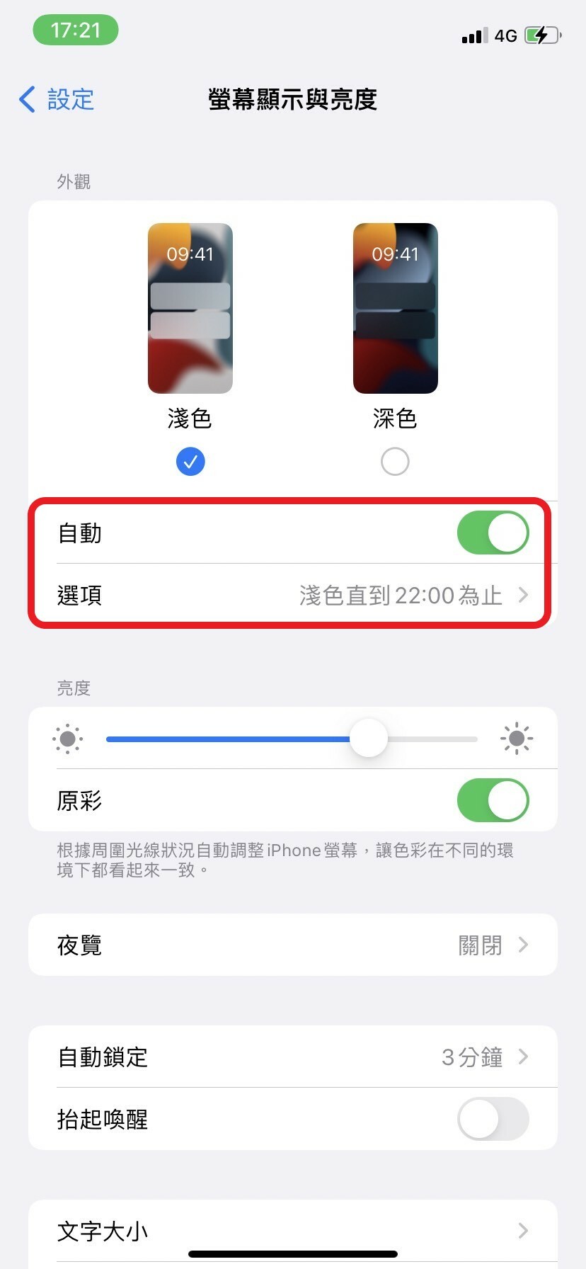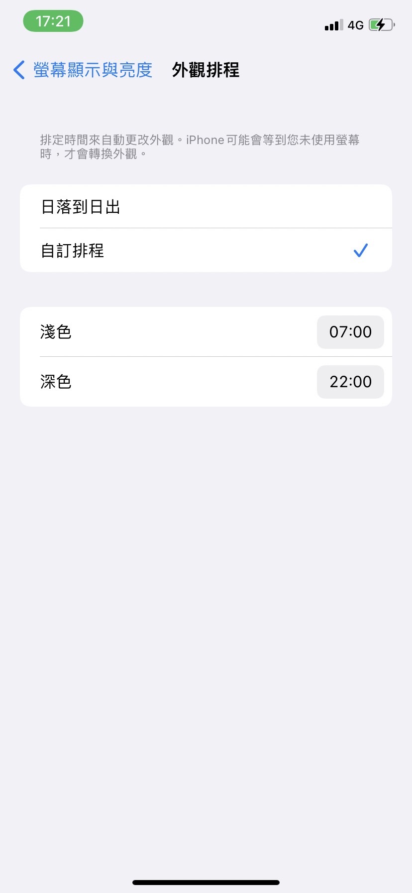 開啟「設定」-> 點選「螢幕顯示與亮度」-> 打開「自動」-> 點擊「選項」,除了可以選擇「日落到日出」,讓iPhone自動幫你依照時間切換「淺色/深色模式」之外,也可點選「自訂排程」,依照平常自己的使用習慣設定時間。