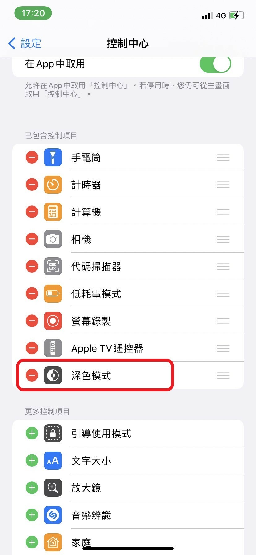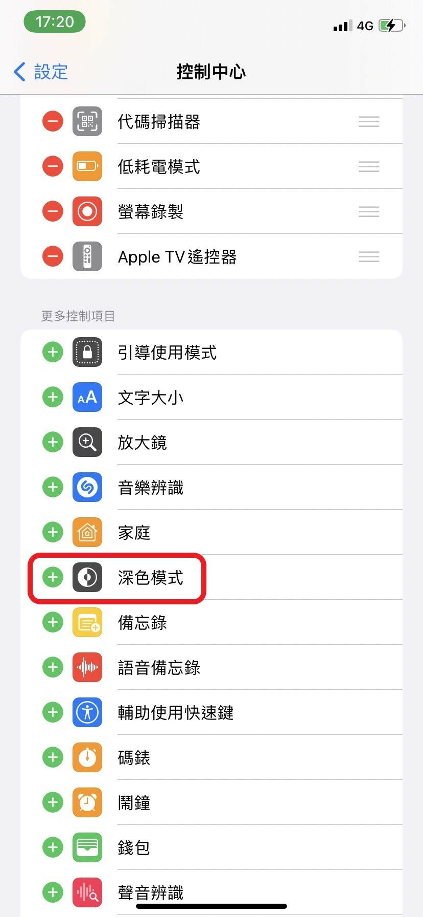 開啟「設定」-> 點選「控制中心」-> 找到「深色模式」點選左方的「+」,即可將「深色模式」加入至iPhone控制中心。