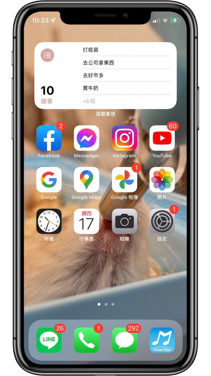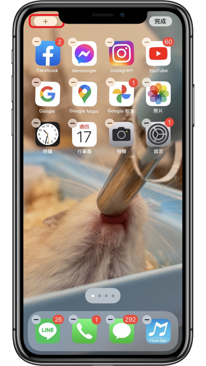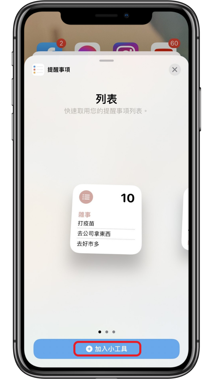 長壓 iPhone 手機桌面不放至出現抖動畫面 -> 點選右上角「+」-> 找到提醒事項並點擊,接下來可以照自己的喜好選擇提醒事項小工具的大小,然後點選下方「加入小工具」即可。