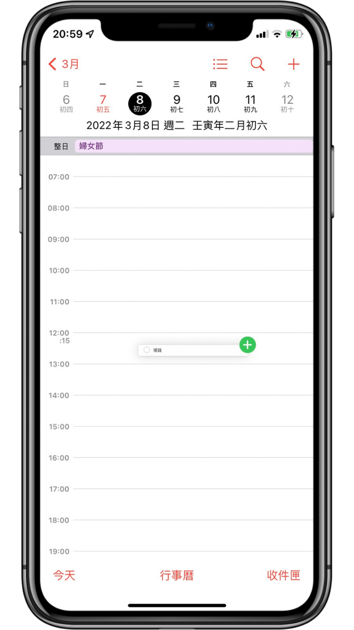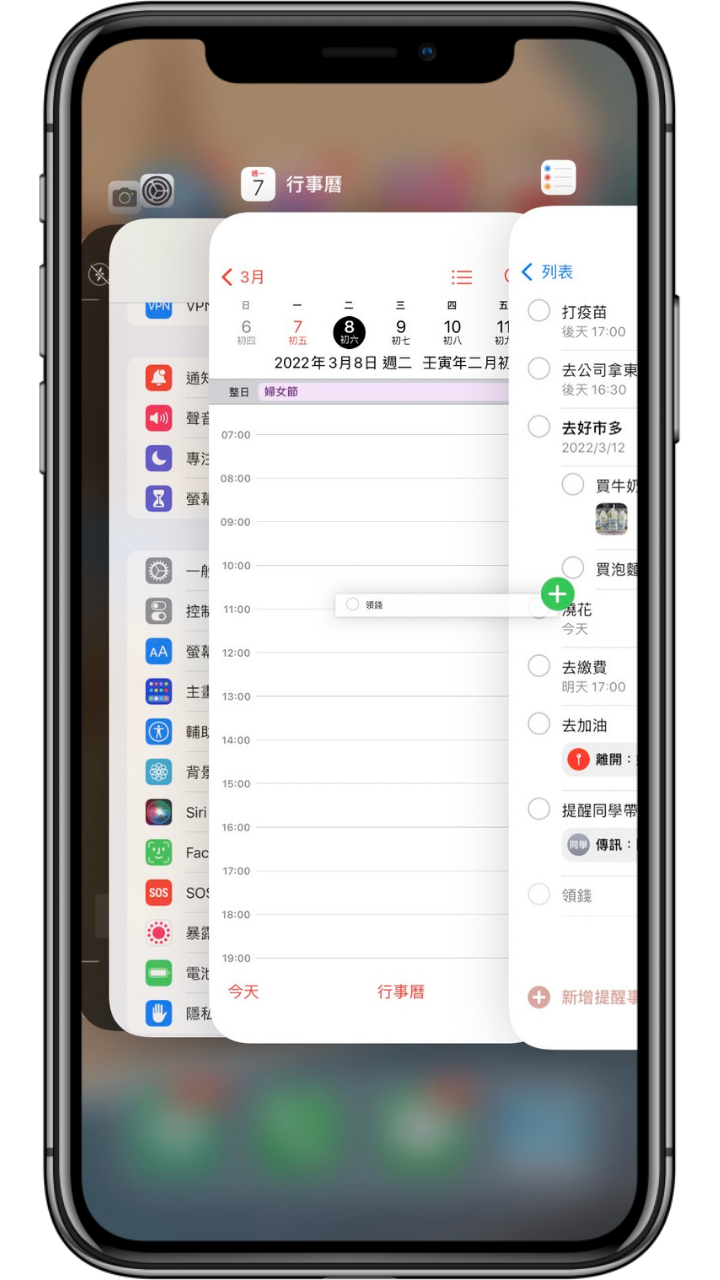 如果想將某項提醒事項快速加入至行事曆,可以先將「行事曆」打開,再打開「提醒事項」APP,右手手指長按拖曳住要加入行事曆的提醒事項後,再用左手手指左右滑動螢幕下方切換APP,點進「行事曆」APP後,拖曳到要新增的時間軸然後放開,就可以將提醒事項快速新增至行事曆了。