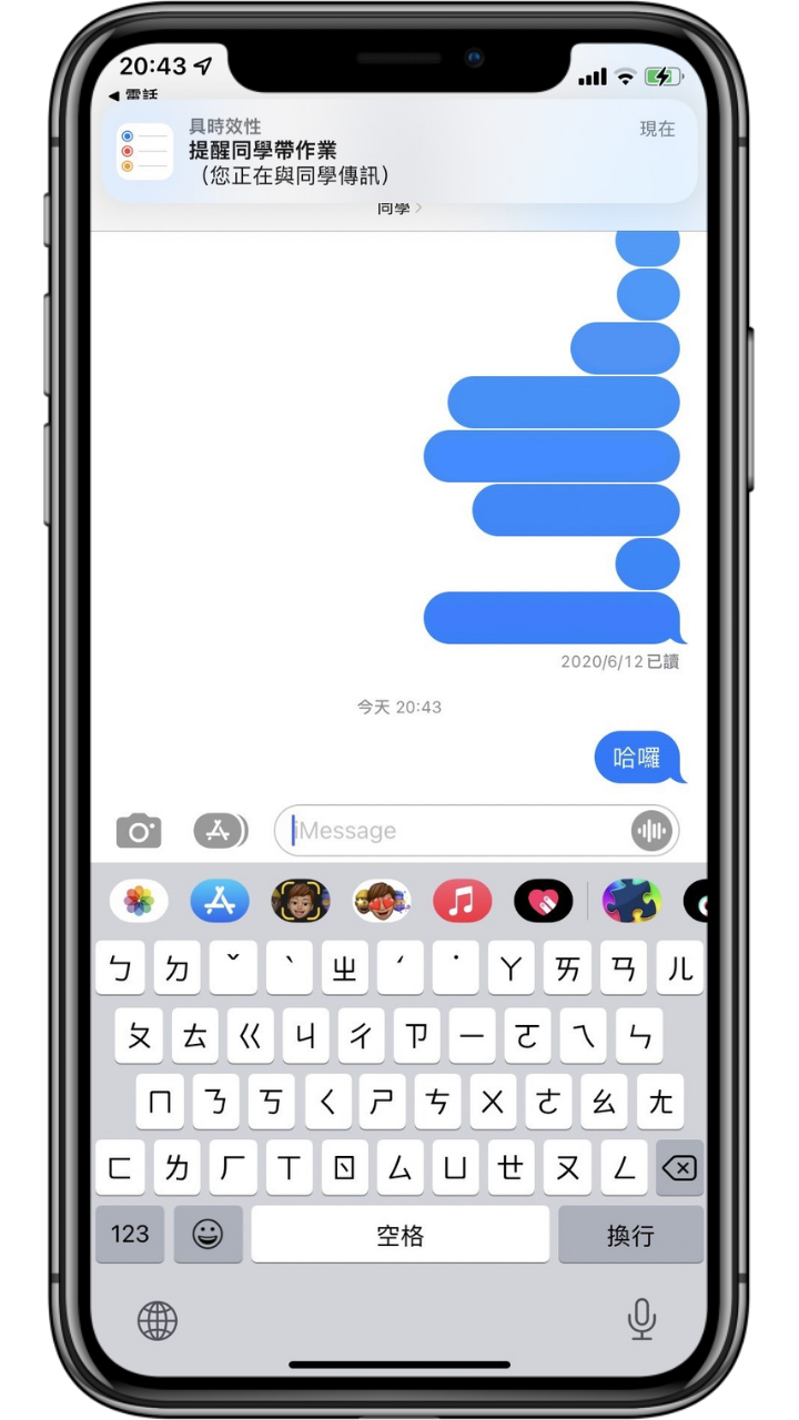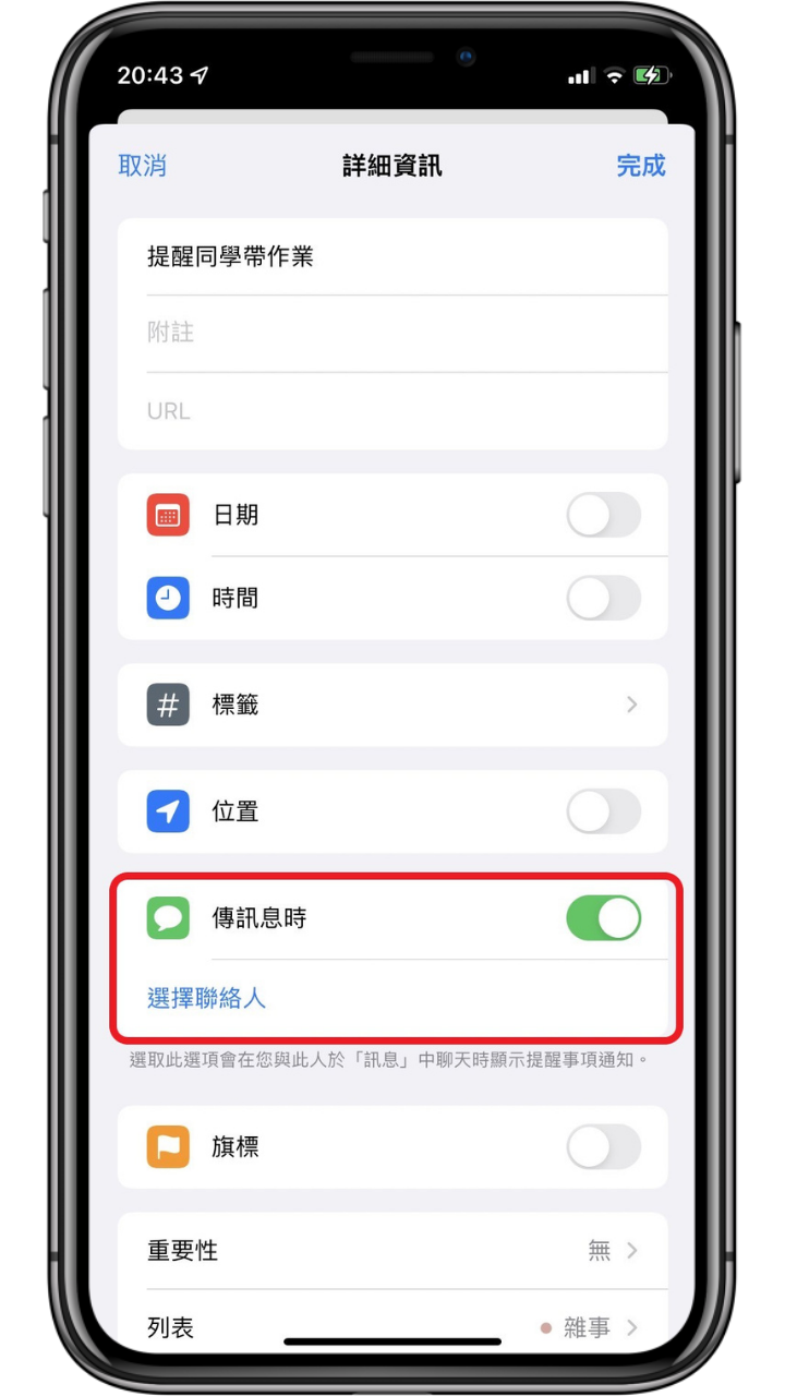 如果和朋友在用iPhone內建「訊息」APP聊天時,有時會忘記要和朋友講的事,這時就可以新增提醒事項,並且將下方「傳送訊息時」開啟,選擇傳送訊息的聯絡人即可,這樣之後如果在跟朋友聊天,也不怕忘記要和朋友說的事情。