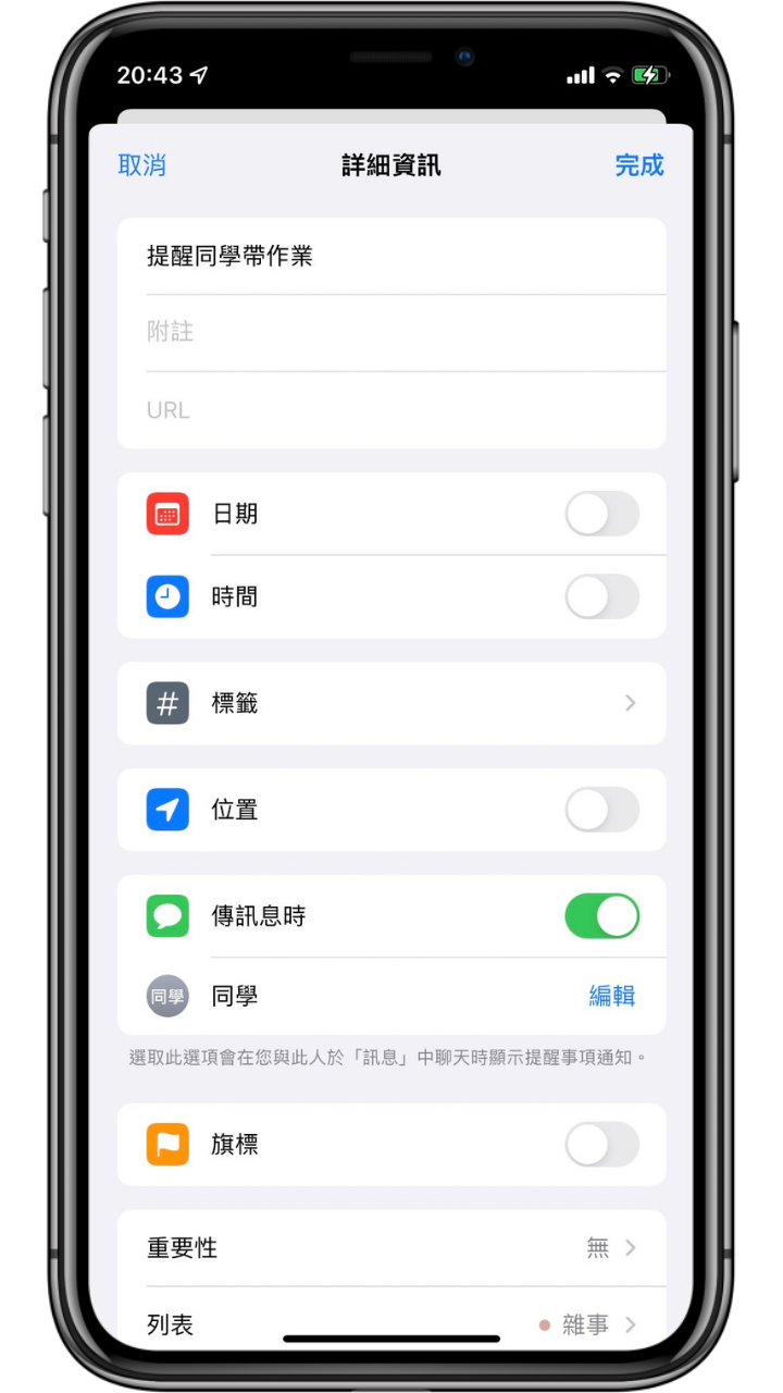 如果有許多同類型的提醒事項,也可用「標籤」來做區分。