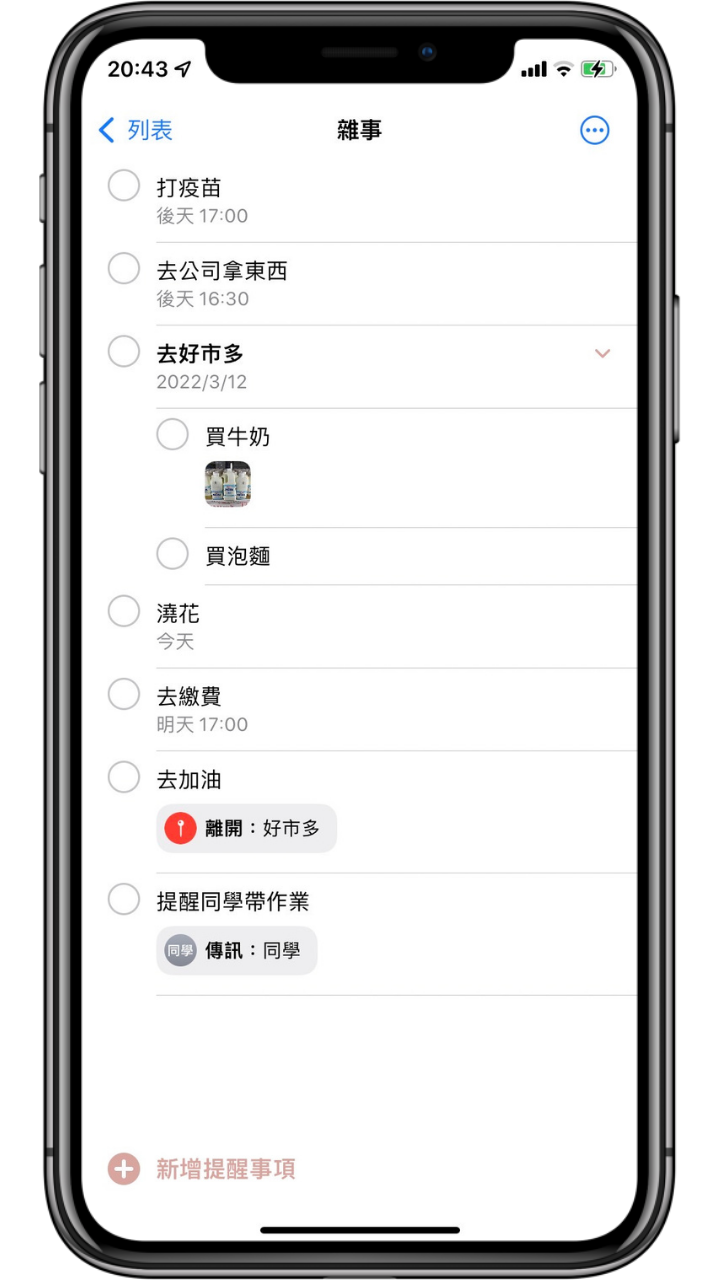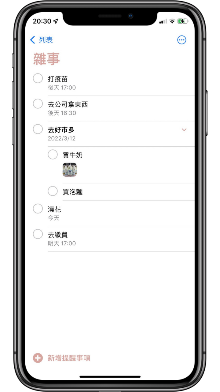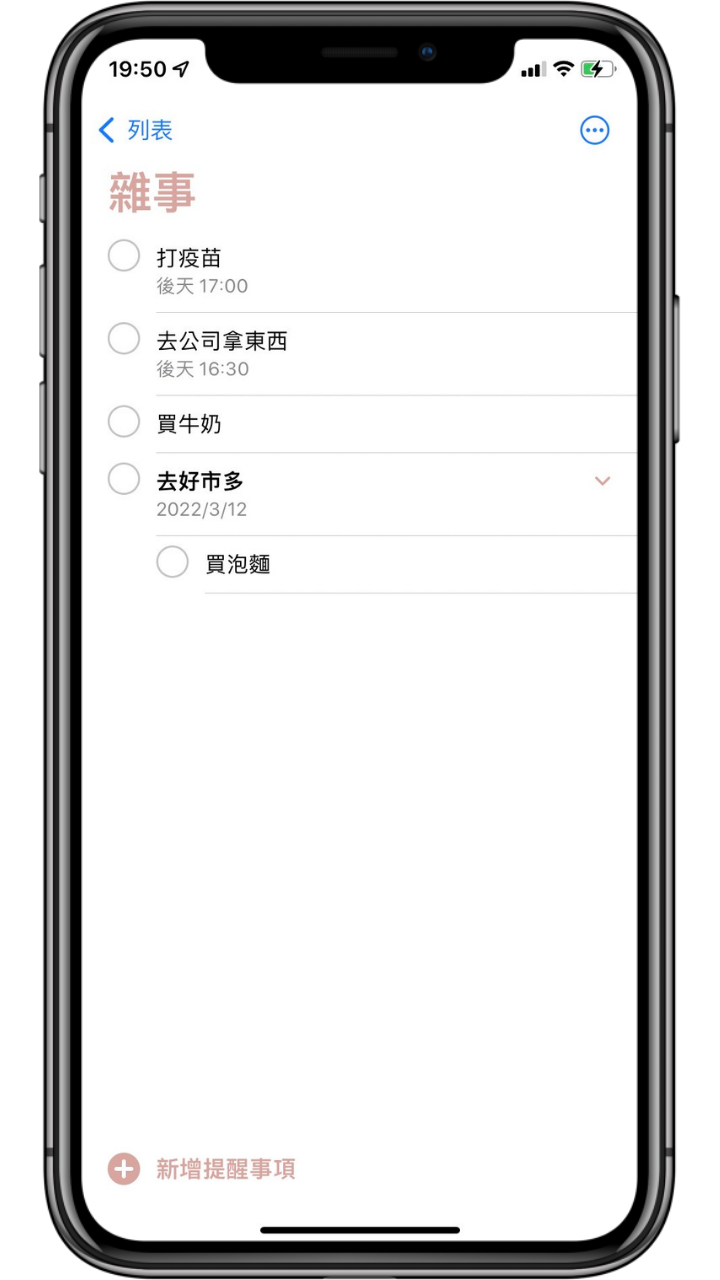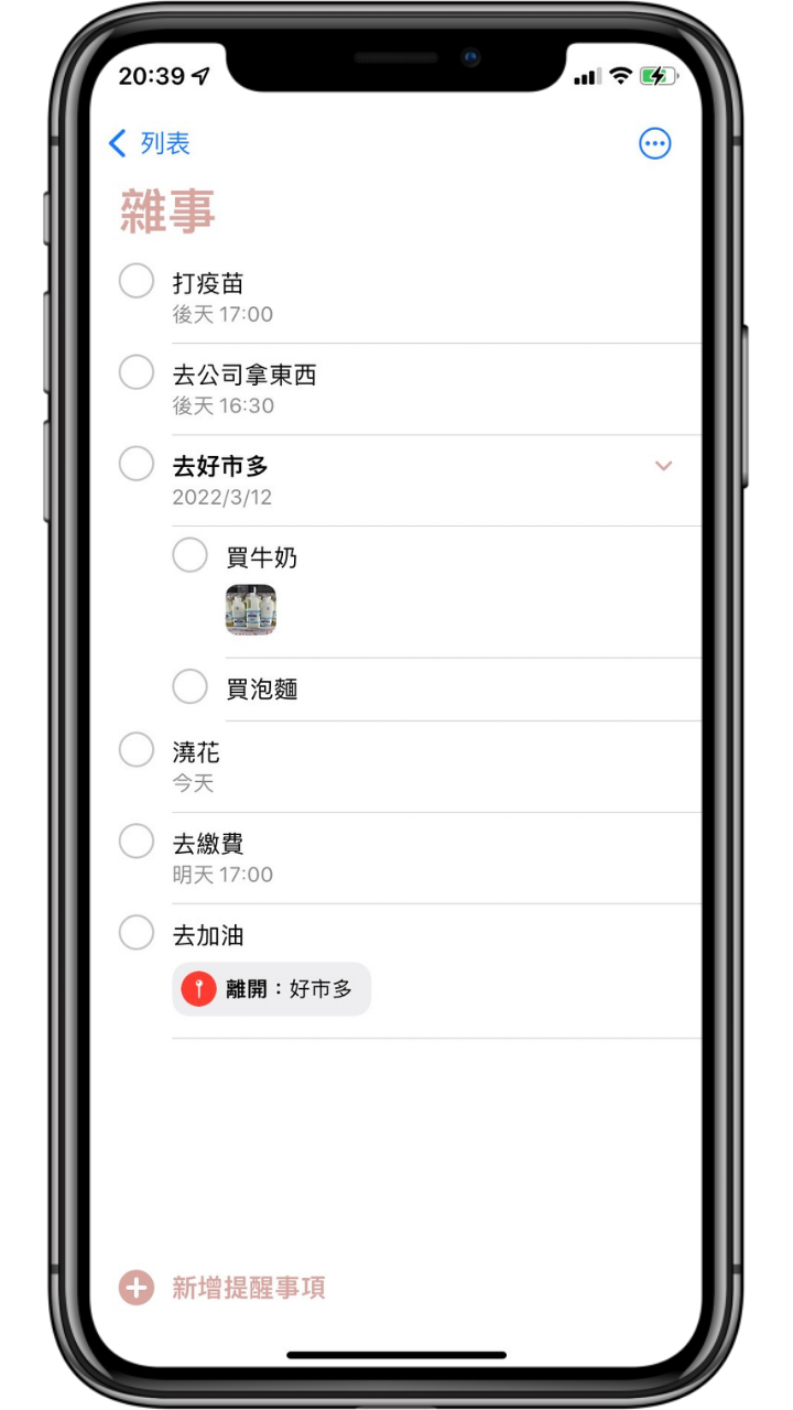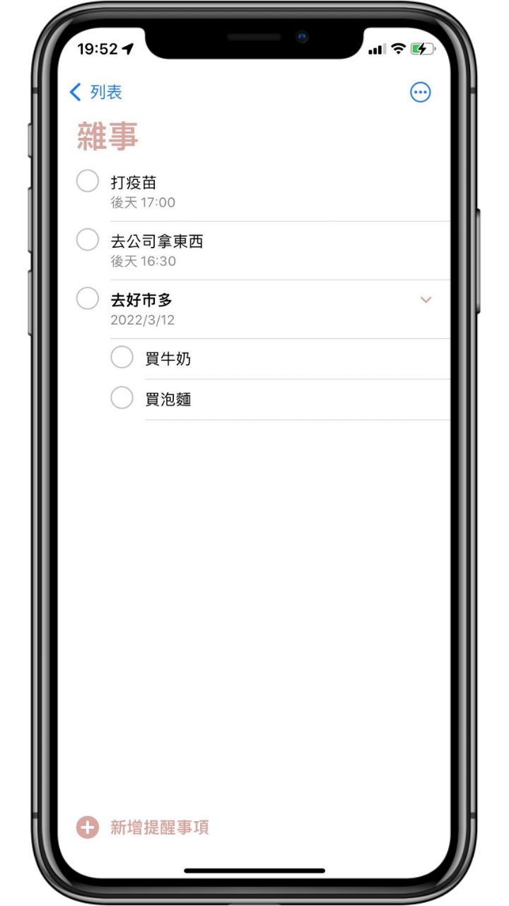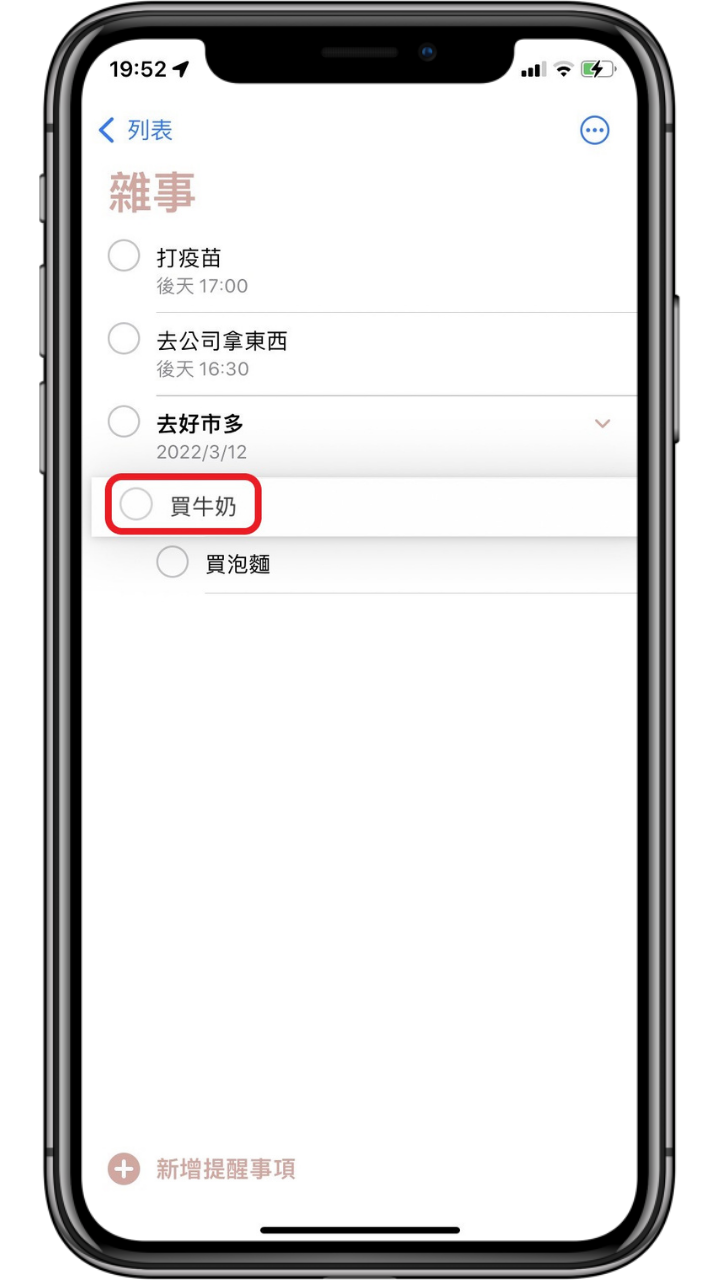 假如遇到像「買牛奶」這樣的情況,它不是在「去大賣場下方,這時就可以長按這個提醒事項並拖曳到「去大賣場」的下方,就可直接將「買牛奶」放入「去大賣場」的子任務。
