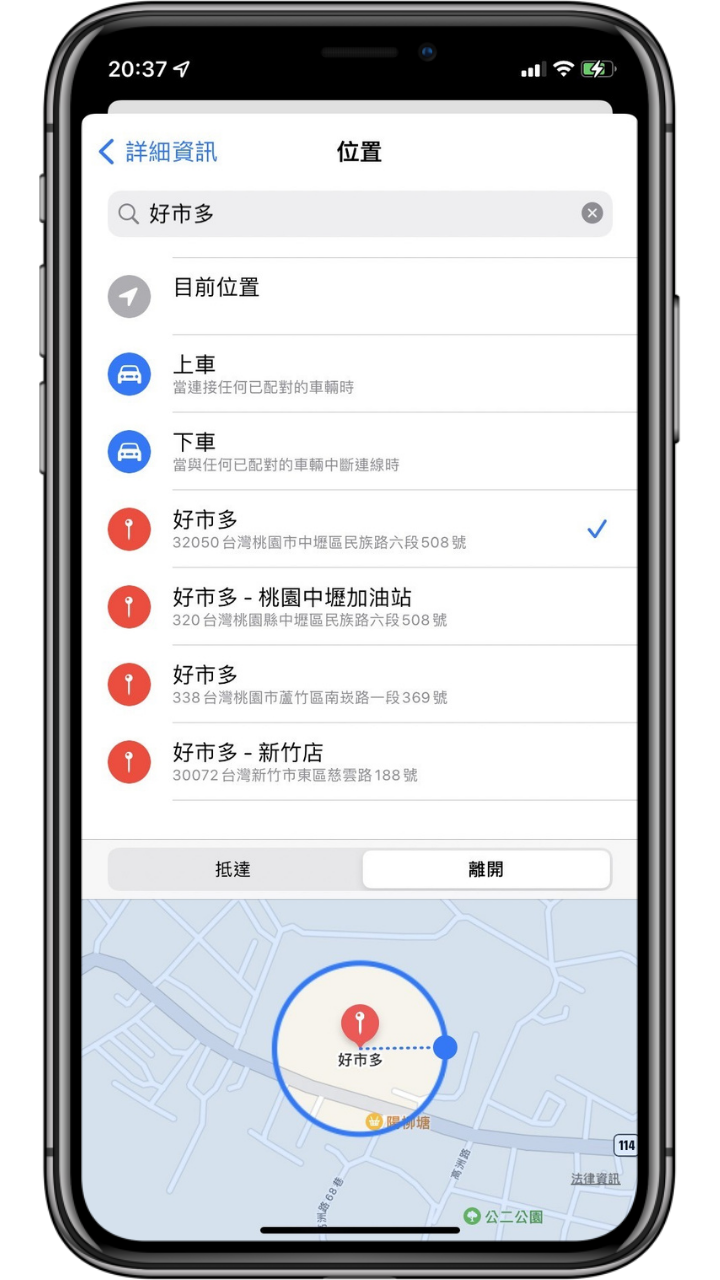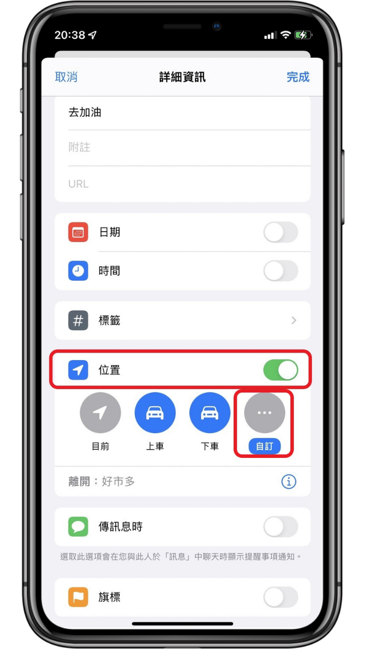 進入提醒事項的詳細資訊頁面後,打開下方「位置」,可以依照自己的需求設定「抵達」或「離開」某個地方時發出提醒。(下方範例是選擇「自訂」)