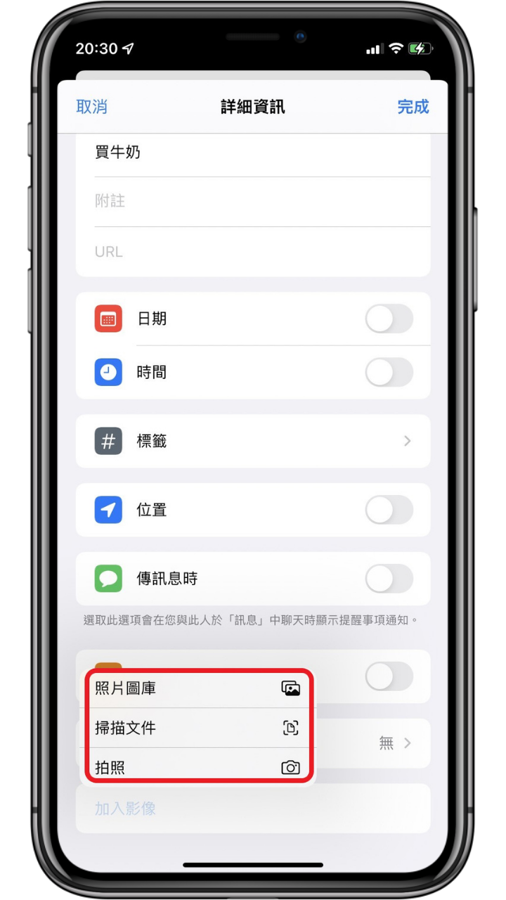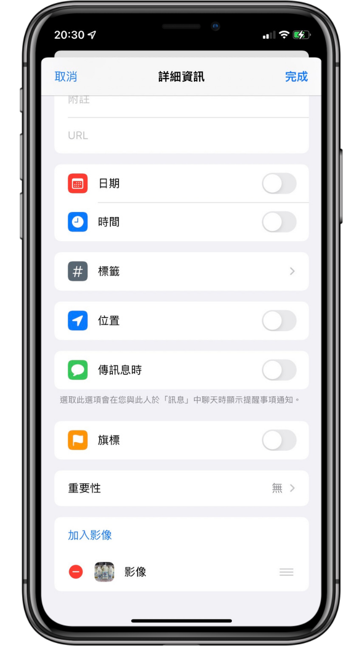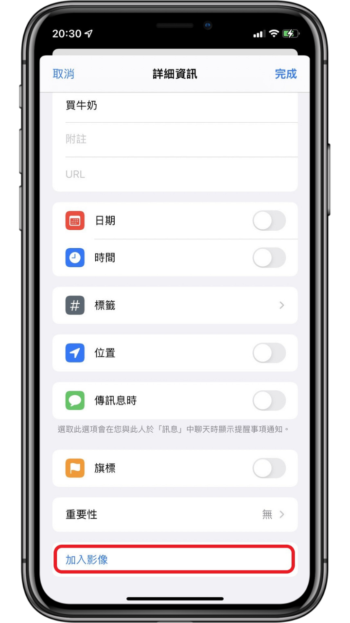 如果是建立購買清單,又怕買錯的話可以新增照片來提醒自己。進入提醒事項的詳細資訊頁面後,點選最下方「加入影像」選項,選擇加入圖片的方式,就可以替提醒事項加入影像附件,日後也可起到提醒作用。