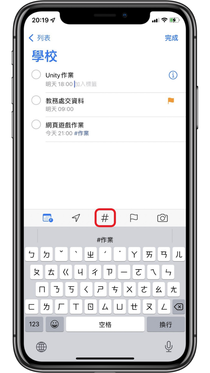 點選要新增標籤的提醒事項後,點選「#」符號,即可快速增加標籤。
