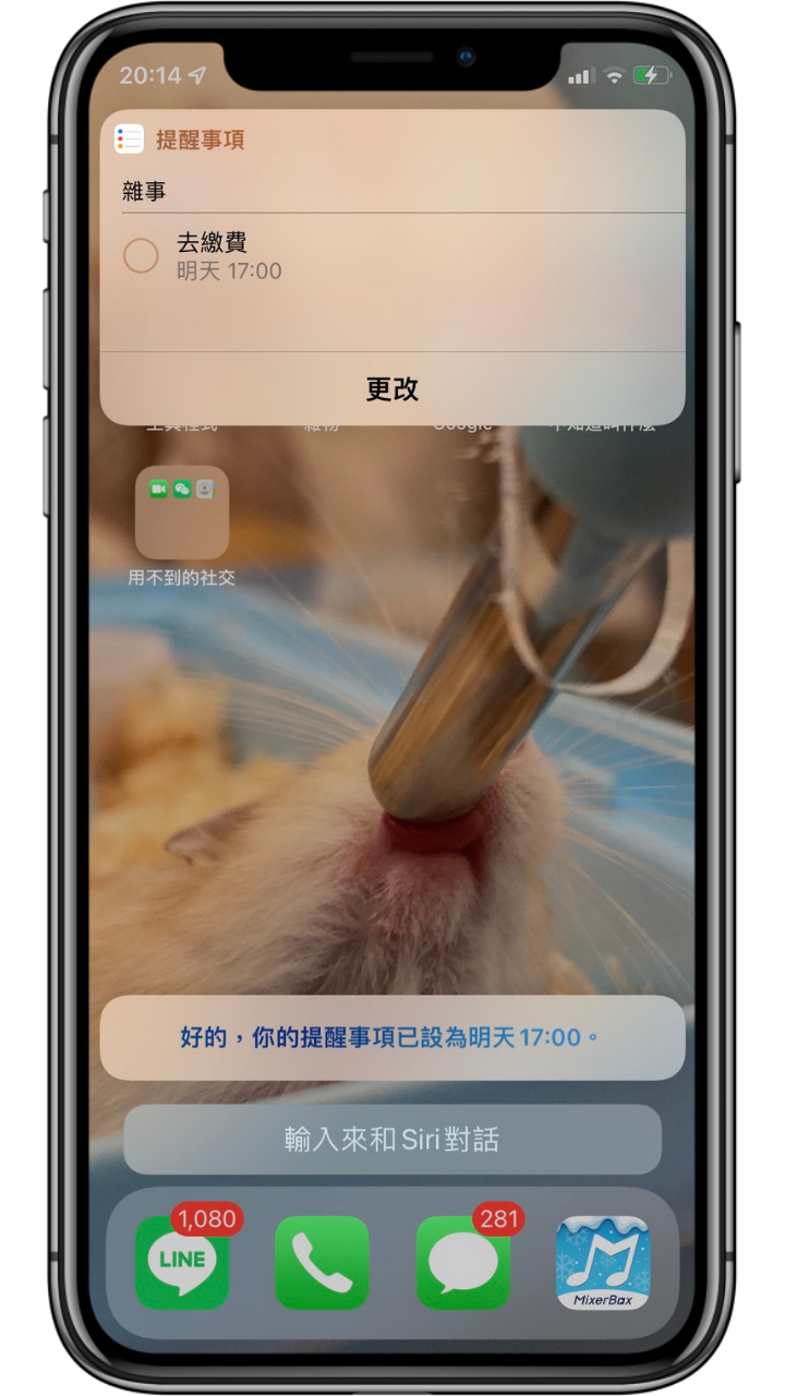如果想快速新增提醒事項的話,可以對Siri說「嘿!Siri!提醒我明天下午五點要繳費」,如果要使用這個方法,在述說時一定要提到「提醒」這個關鍵字,並且要提到「時間」、「事情」這兩個要素,這樣才會新增成功。