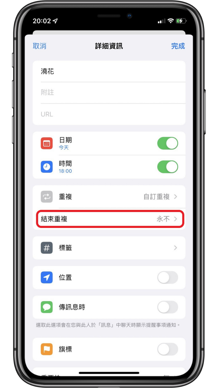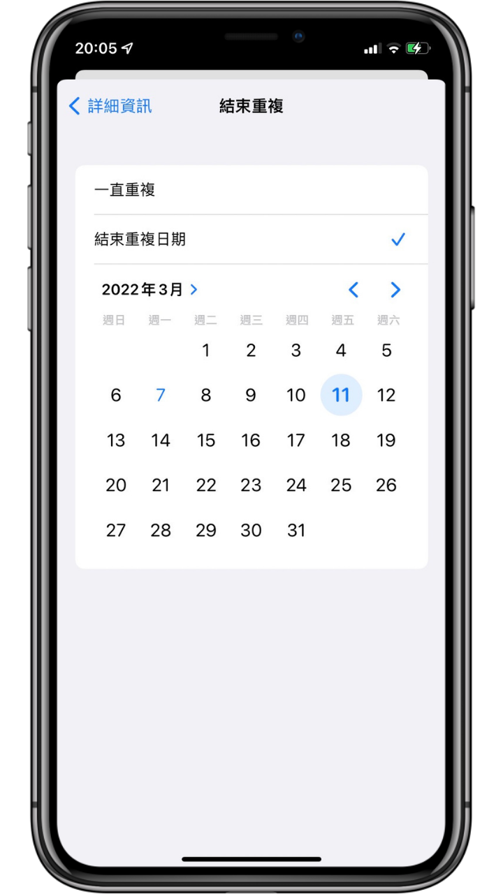 如果是遇到過一段時間就不須提醒這類的提醒事項,例如說吃三天份的藥,也可點選「結束重複」,選擇結束重複提醒的時間。