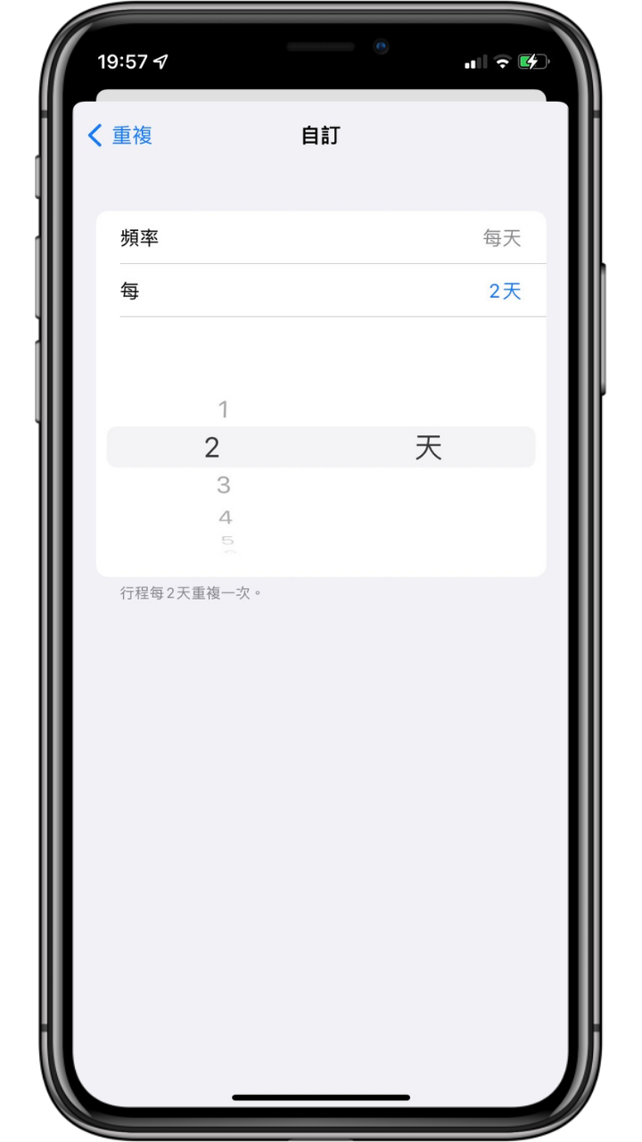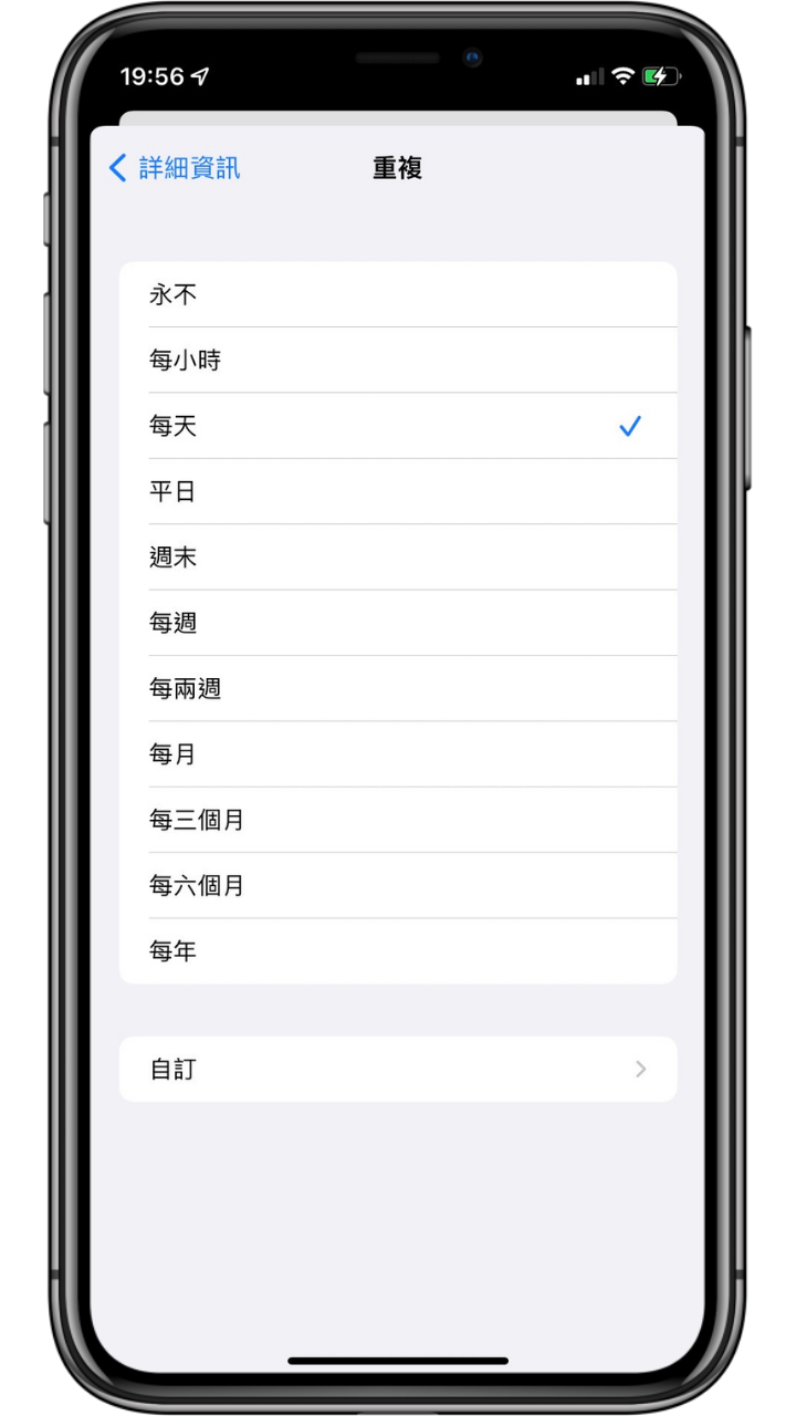 如果是需要自訂時間重複的話,也可選擇下方「自訂」,就可以自由設定需要幾天提醒一次。