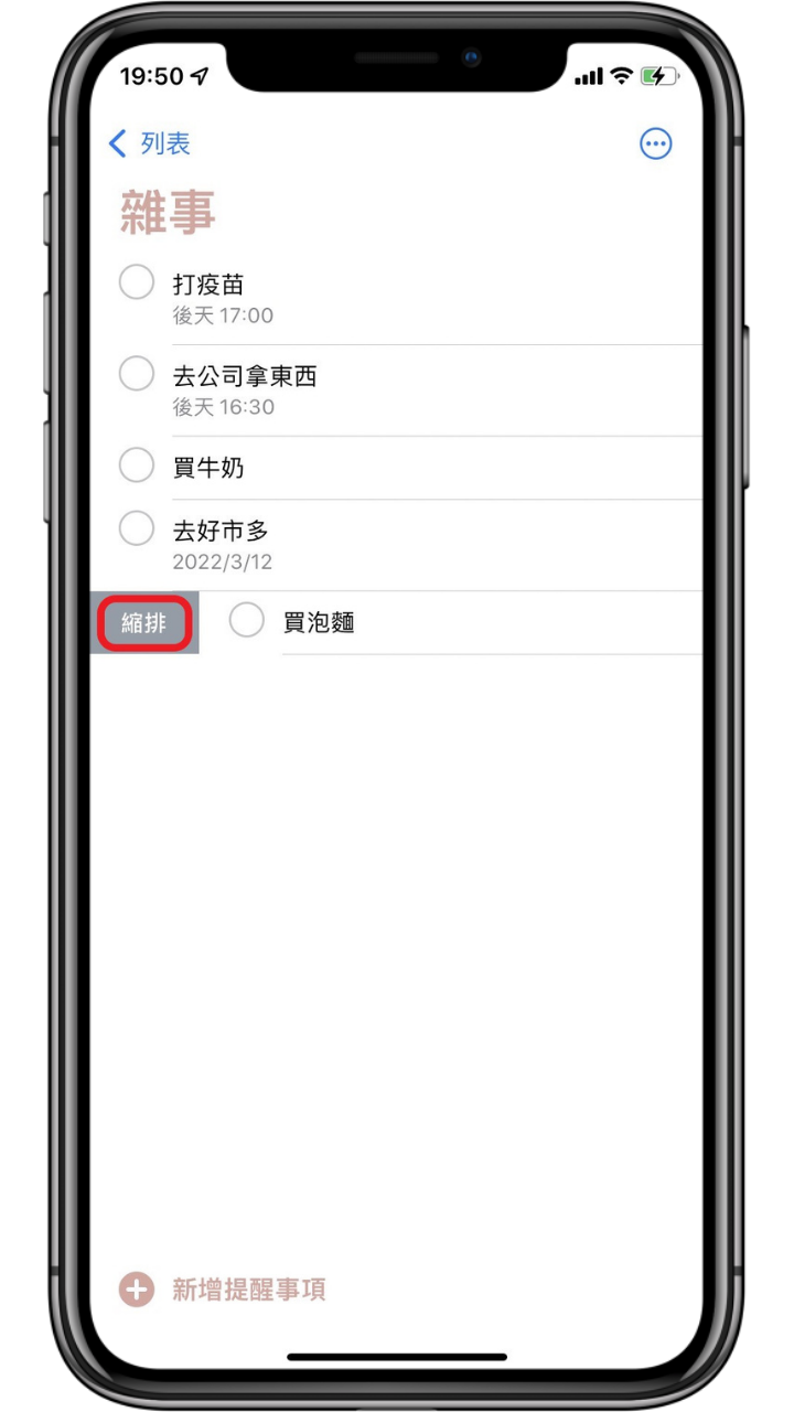 只要將「買泡麵」的提醒事項向右滑就會出現「縮排」的選項,點選它就會變成「去大賣場」底下的子任務。