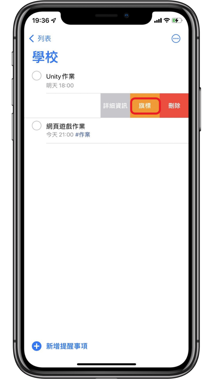 相信這個小技巧大家不陌生,在許多提醒事項裡一定有幾項特別重要的事項,只要找到重要的提醒事項,將其向左滑動就會看見「詳細資訊」、「旗標」、「刪除」三個選項,點選「旗標」即可,就會看見提醒事項右方就會出現橘色旗子的標示。