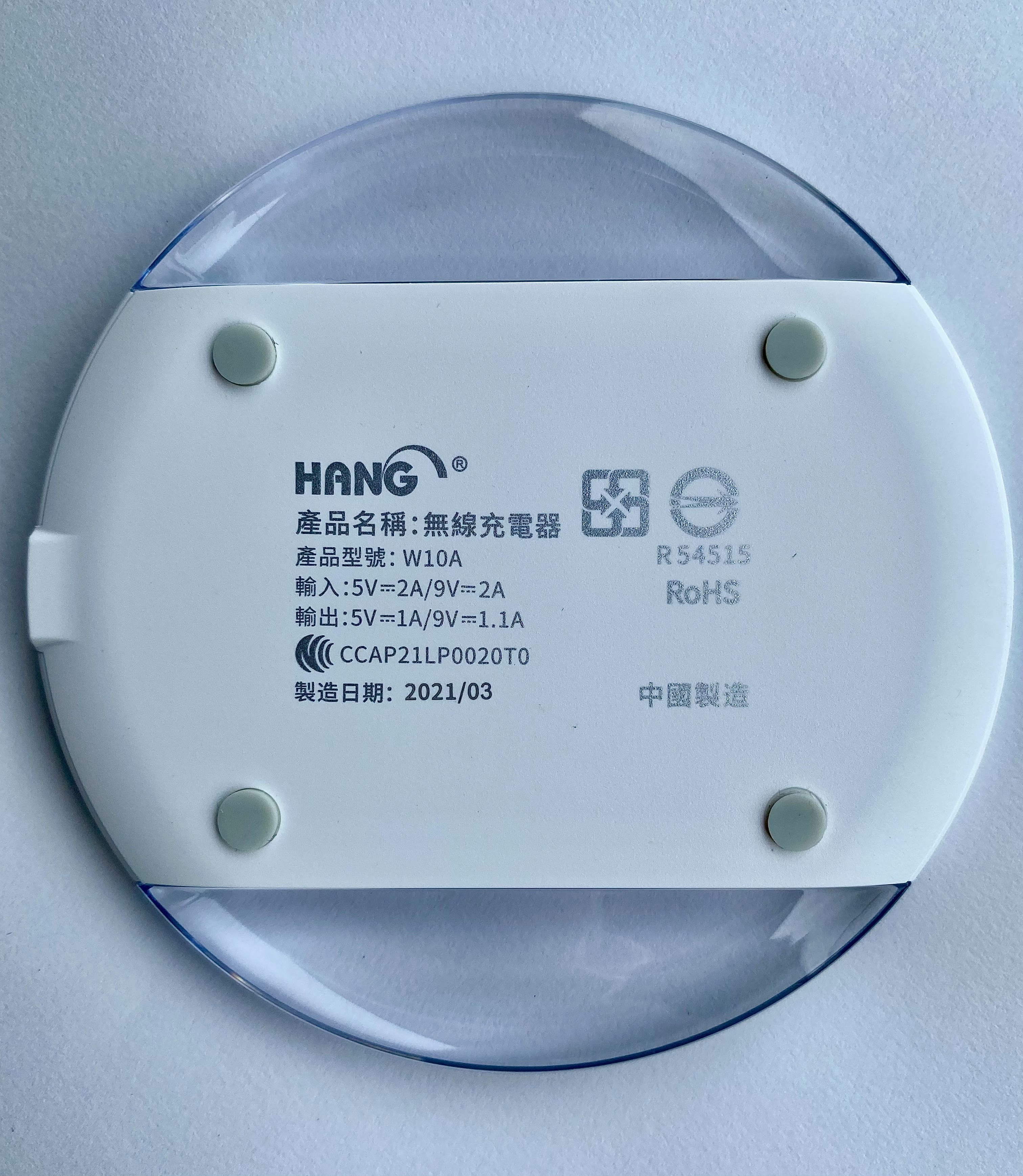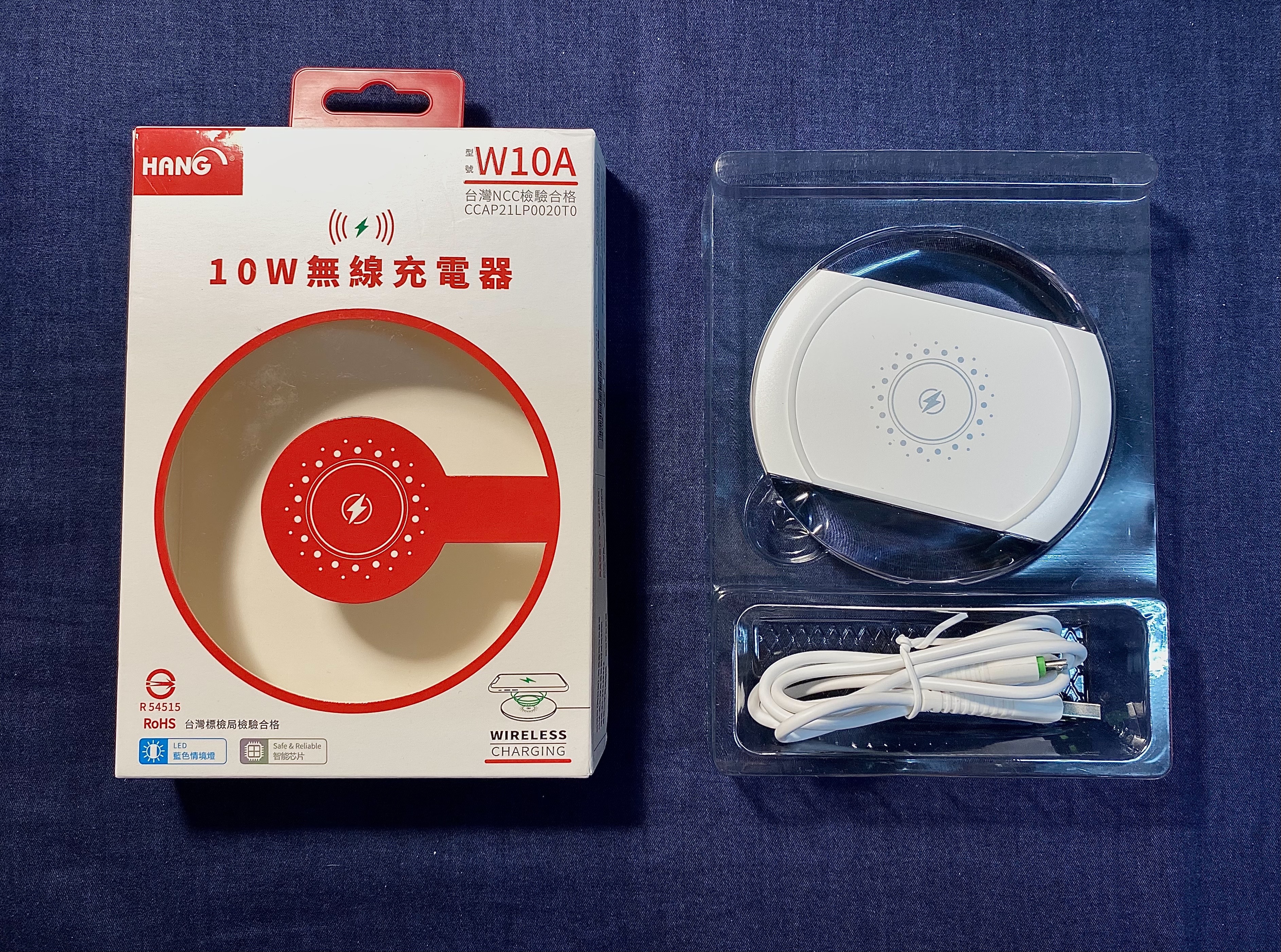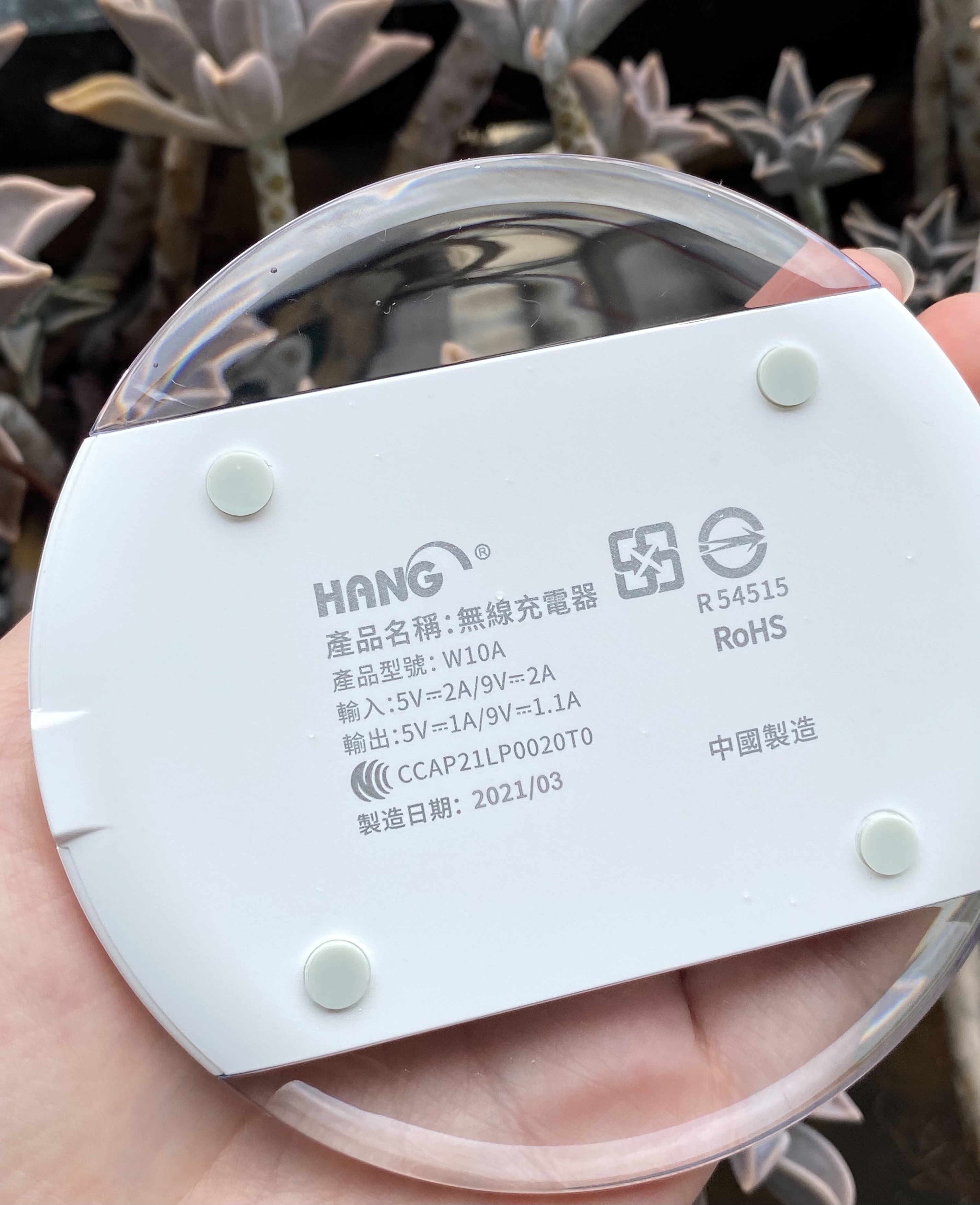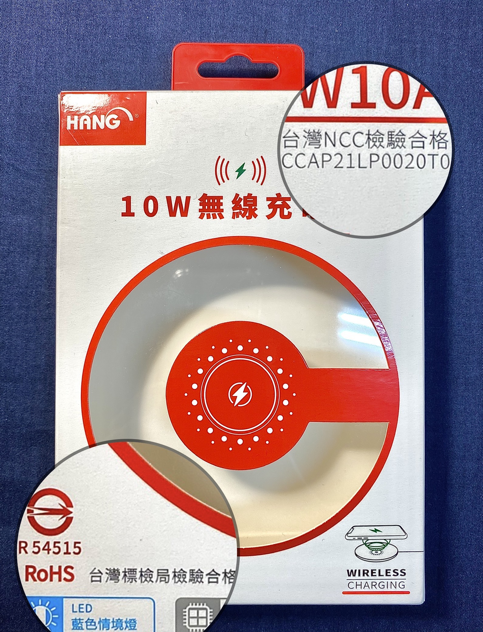 外盒上標示了「台灣NCC檢驗合格」、「RoHS台灣標檢局檢驗合格」等字樣,從外盒就可以簡單看出,這是一款能讓人安心使用的產品,畢竟無線充電盤大部分的使用方式都是擺在臥室,睡前可以直接放上去充電,那麼這類的床邊電子產品安全性就十分重要了。