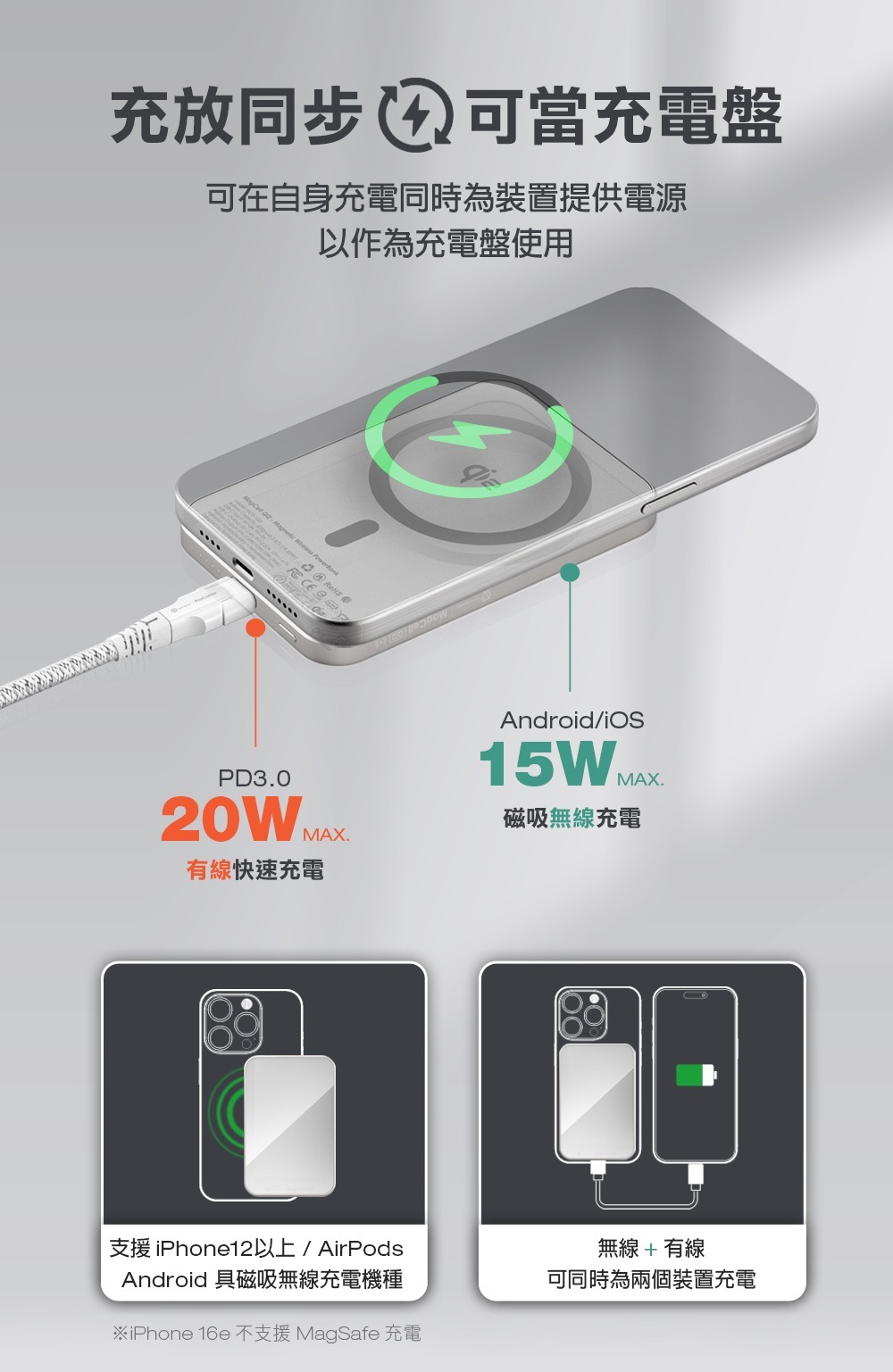 同步充放:支援充放同步, 可作為充電盤使用