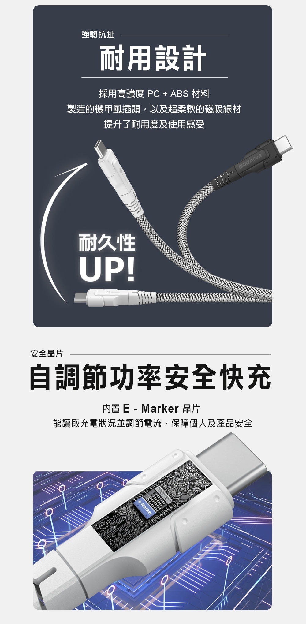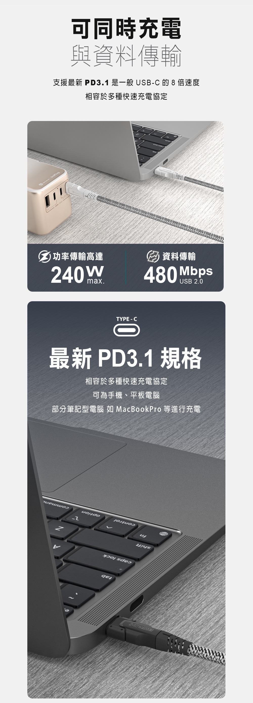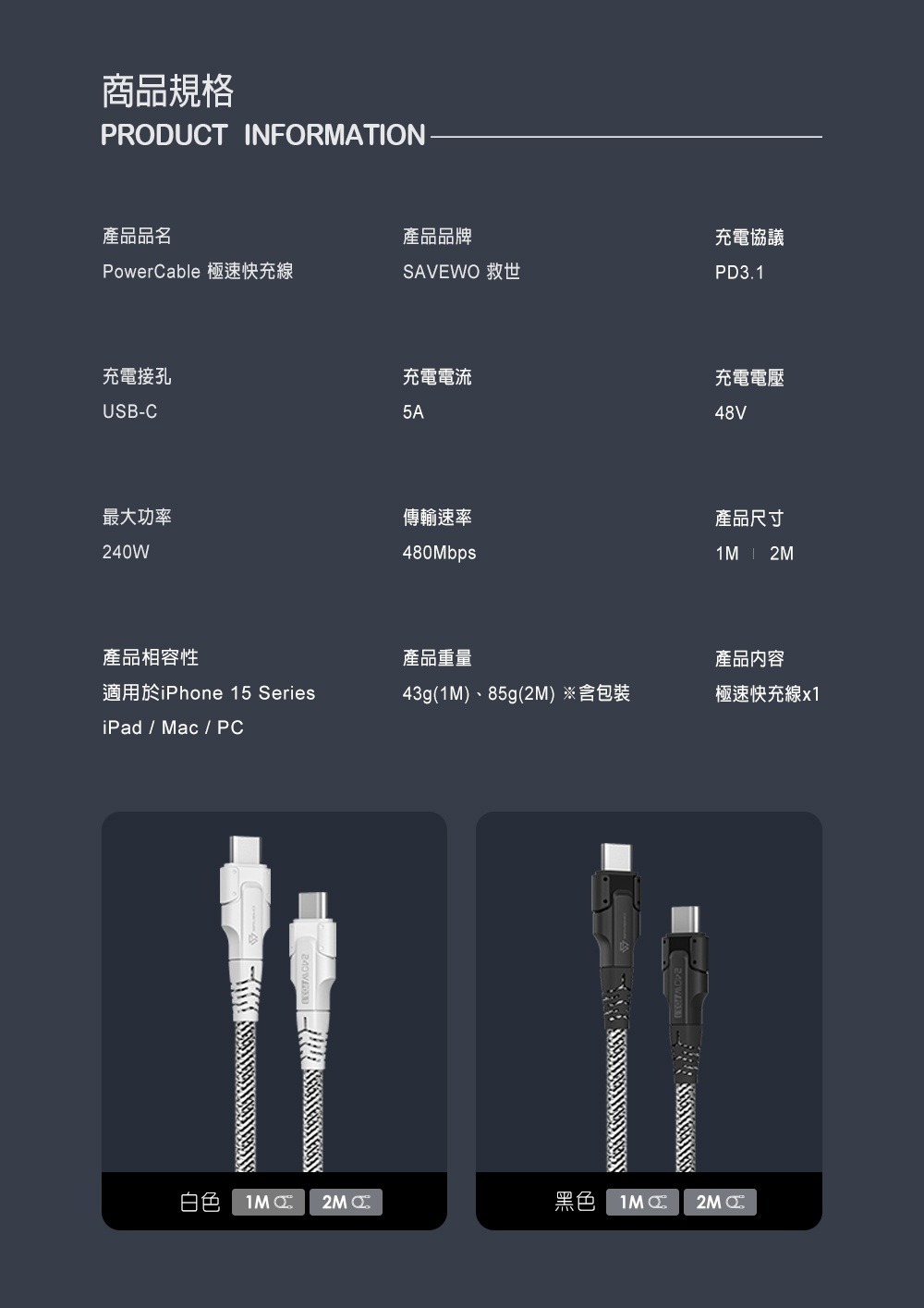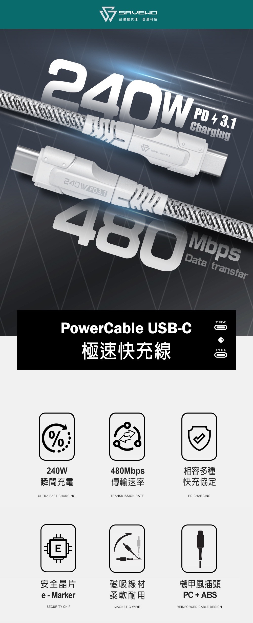 SAVEWO 救世 PowerCable 極速快充線,支援最新PD3.1,功率傳輸高達 240W,比一般 USB-C 線快 8 倍,並且相容於多種快速充電協定,可為手機、平板電腦、部分筆記型電腦如MacBook Pro等進行充電。同時亦具有USB2.0 480Mbps數據傳輸功能。採用高強度PC + ABS 材料製造的機甲風插頭,大大提升了耐用度及使用感受。