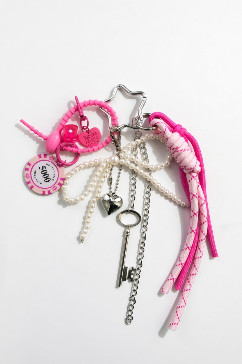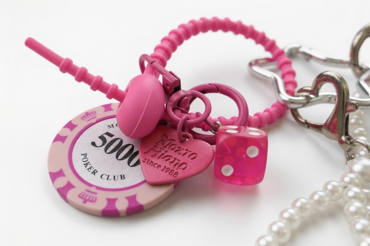 復古符號語彙:精選 5000 點撲克籌碼、半透明桃紅骰子與古銀色老鑰匙,完美復刻千禧年代的街頭玩味感。
