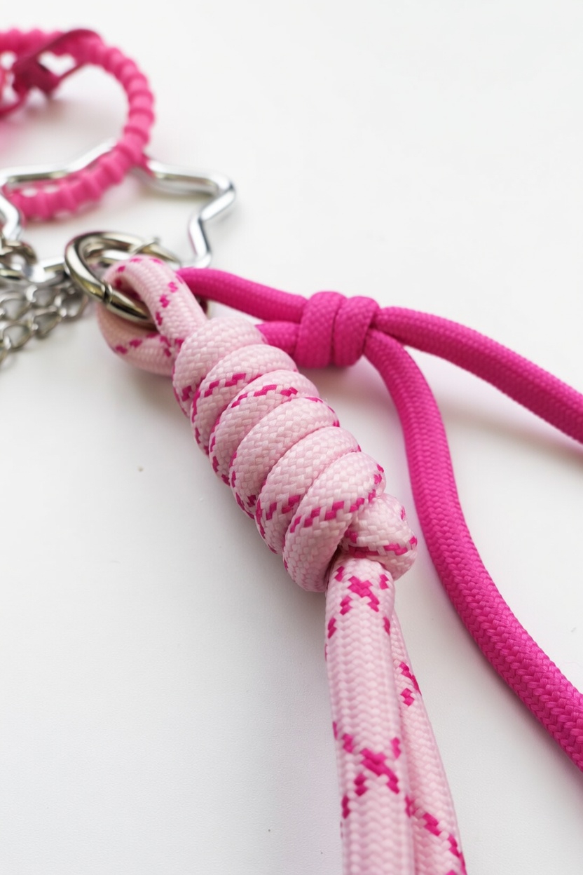 衝突美學材質:採用溫潤珍珠串與高強度機能編織繩的混搭,在視覺上創造出強烈的剛柔並濟感。