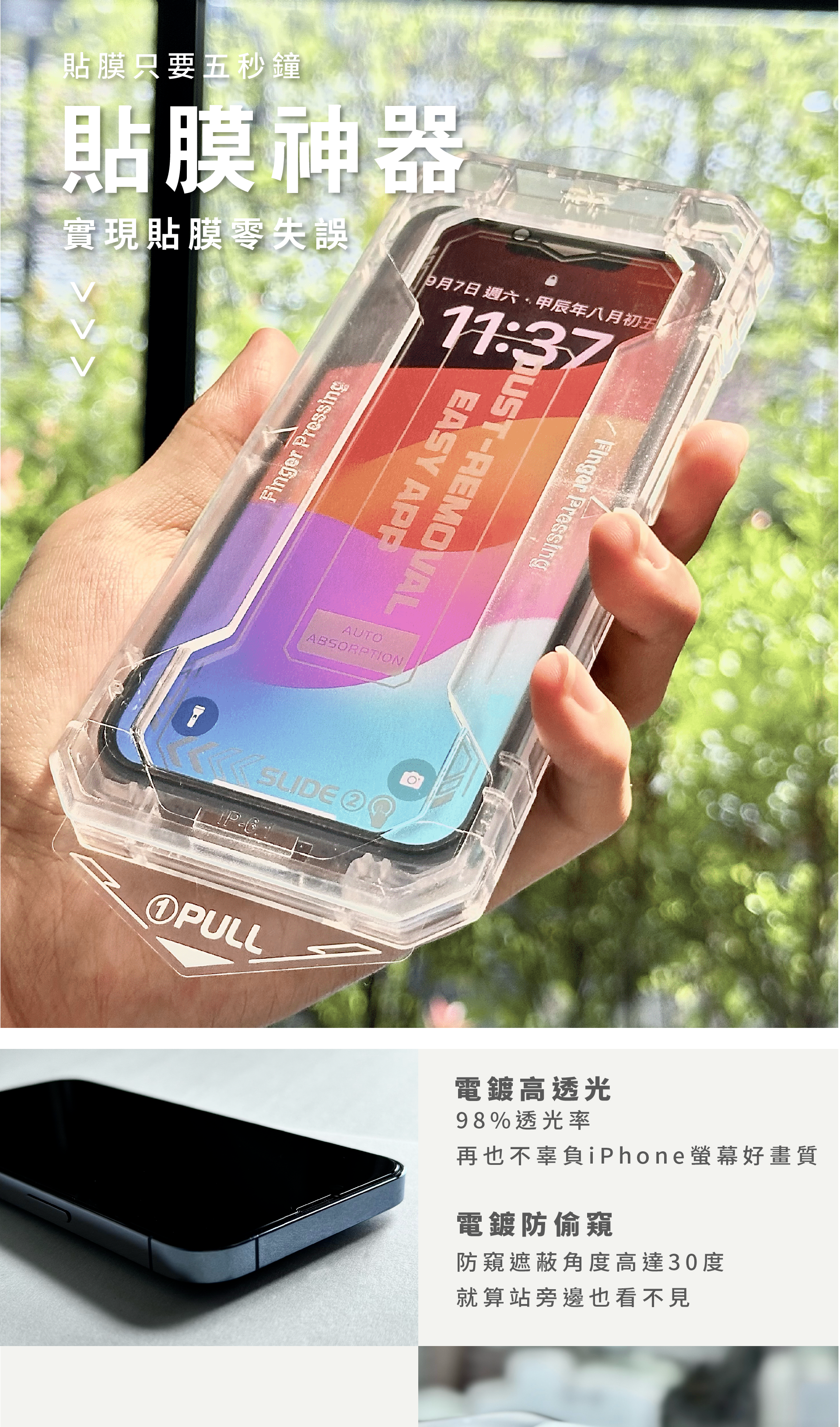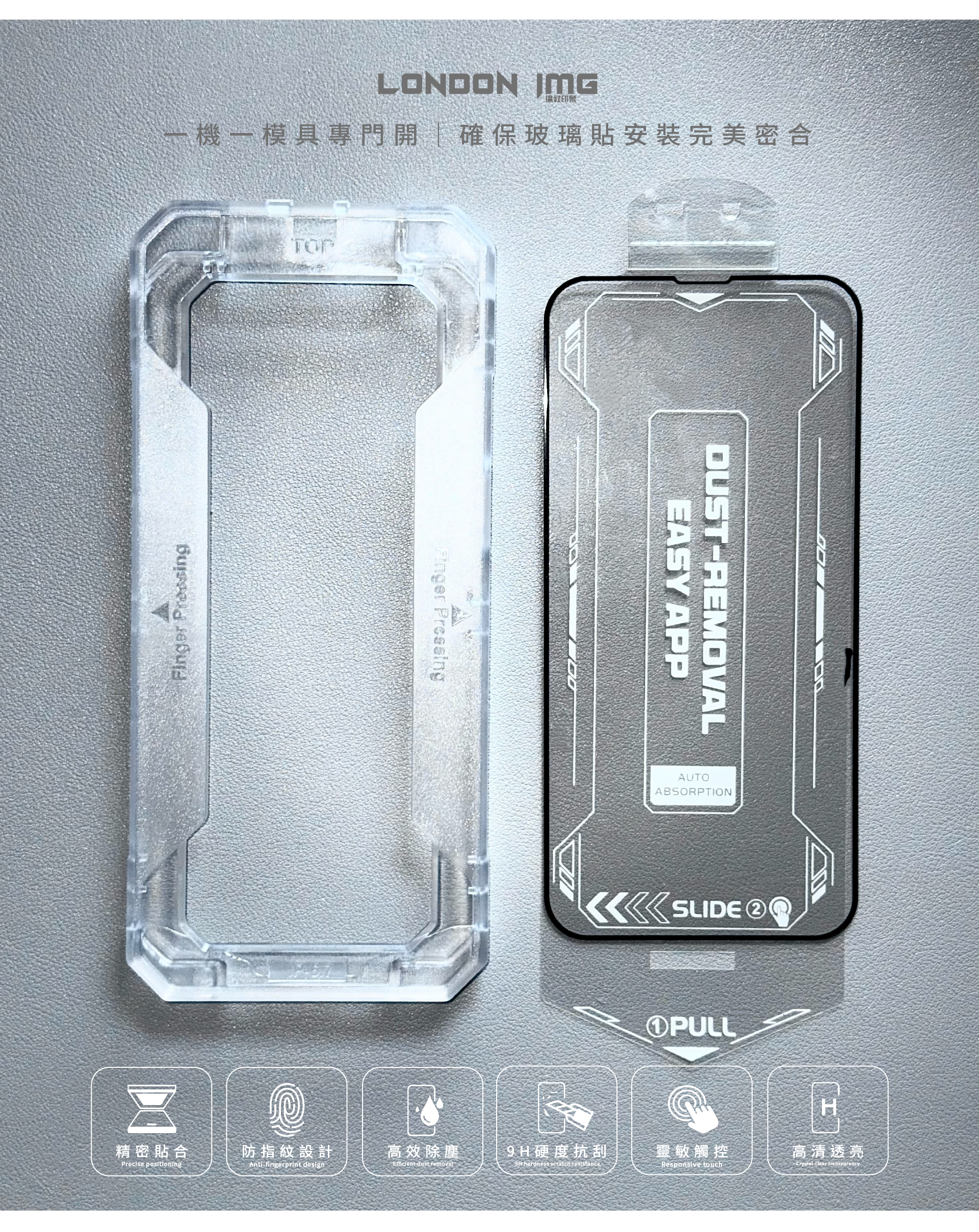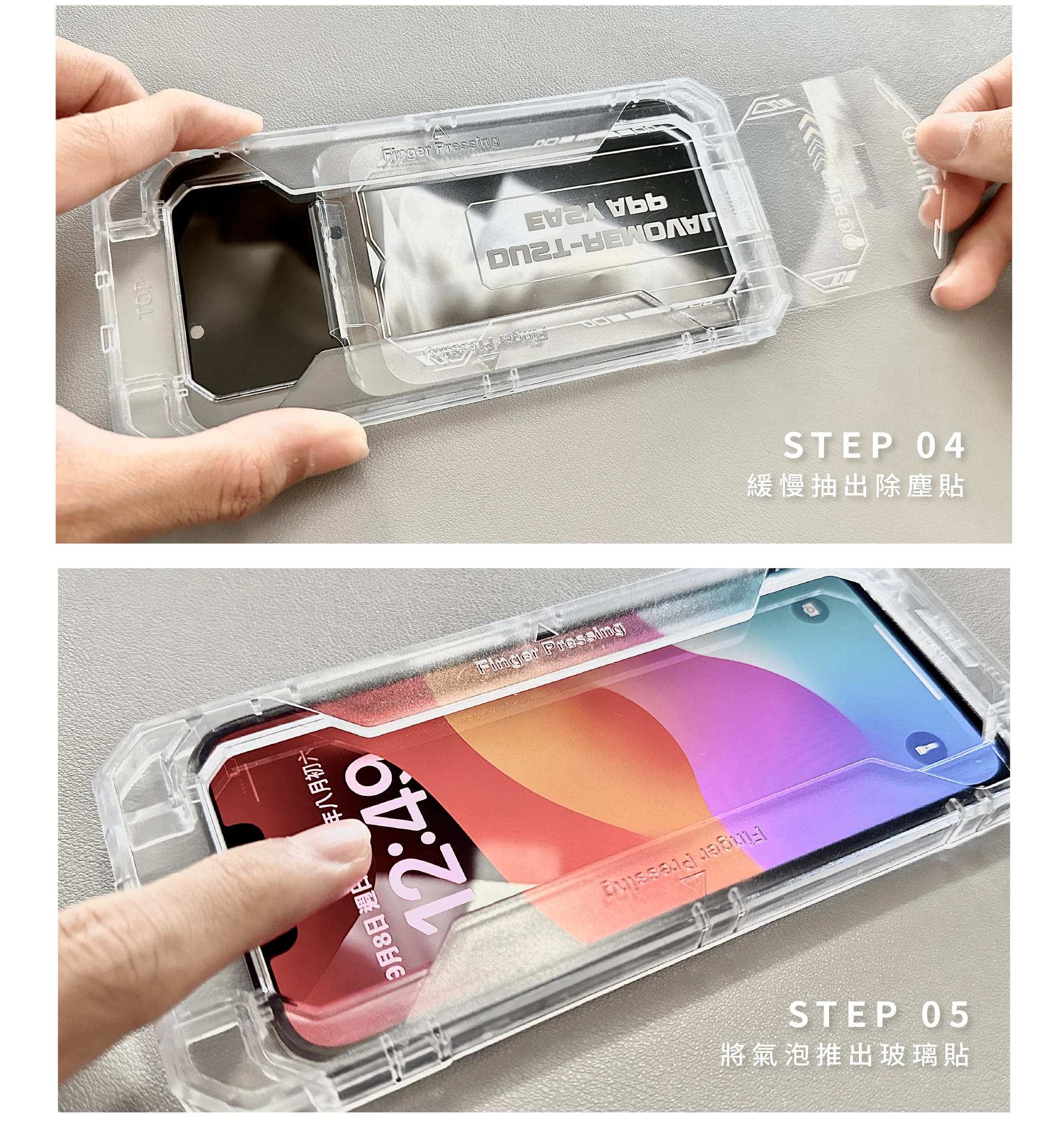 • 無需技術經驗,只需將手機放入工具中,按照指示進行即可輕鬆完成,大大減少傳統貼膜所需之時間。
