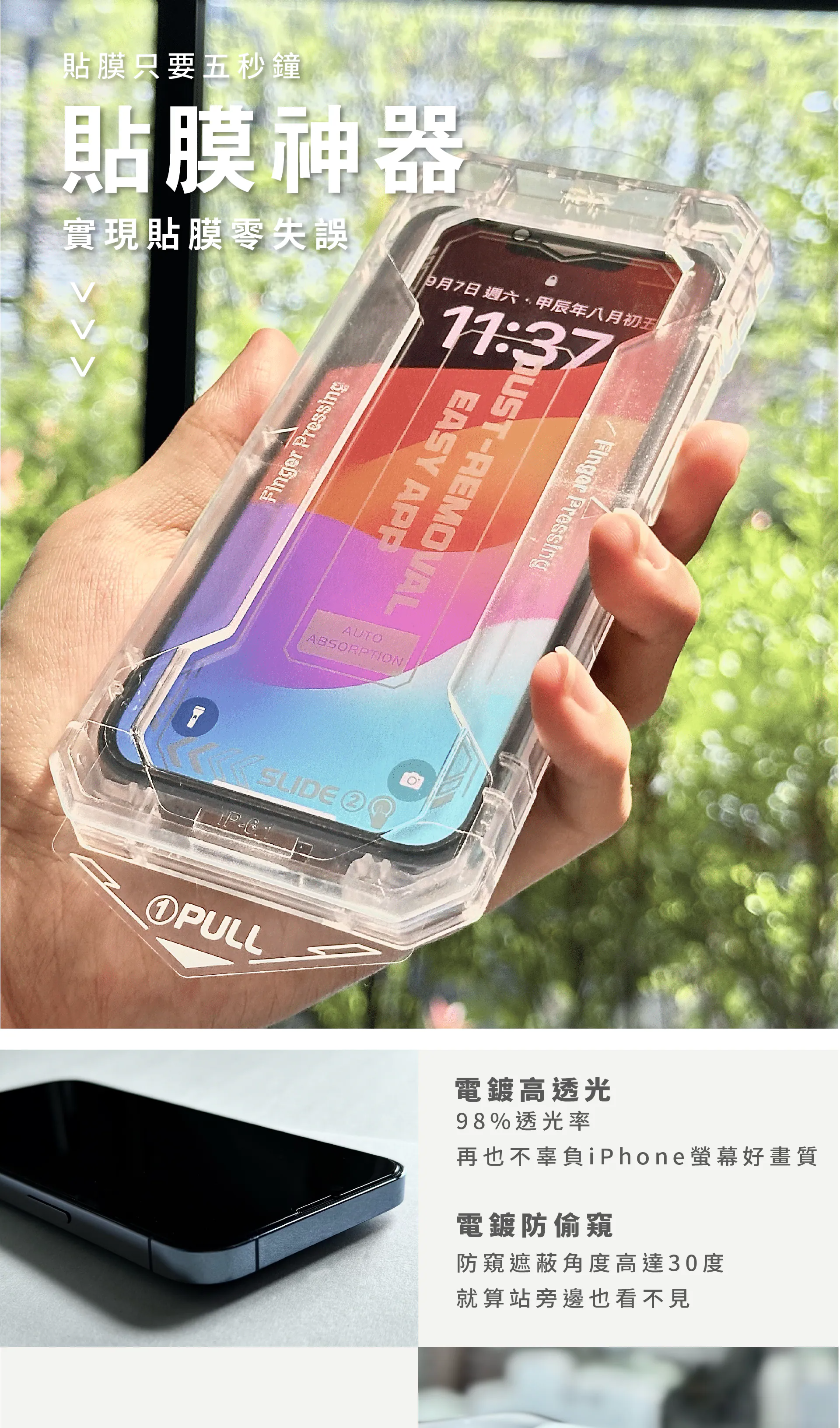 - 無需技術經驗,只需將手機放入工具中,按照指示進行即可輕鬆完成,大大減少傳統貼膜所需之時間。