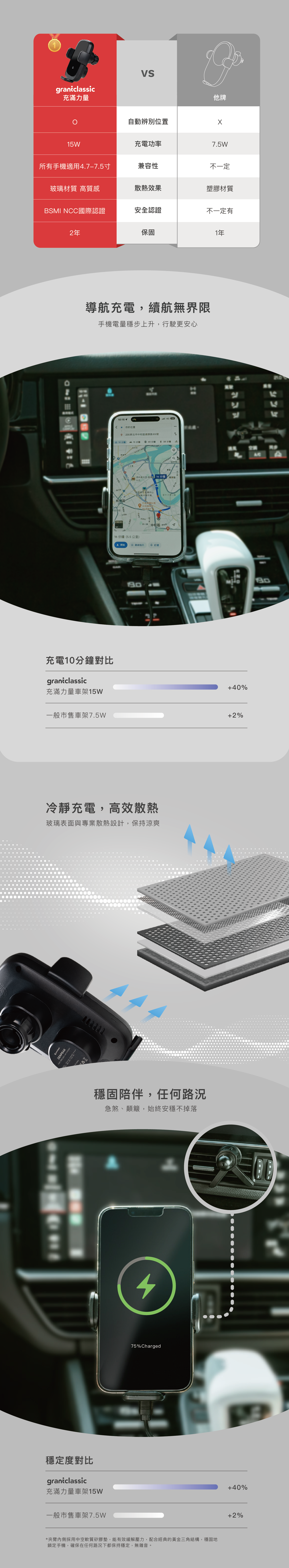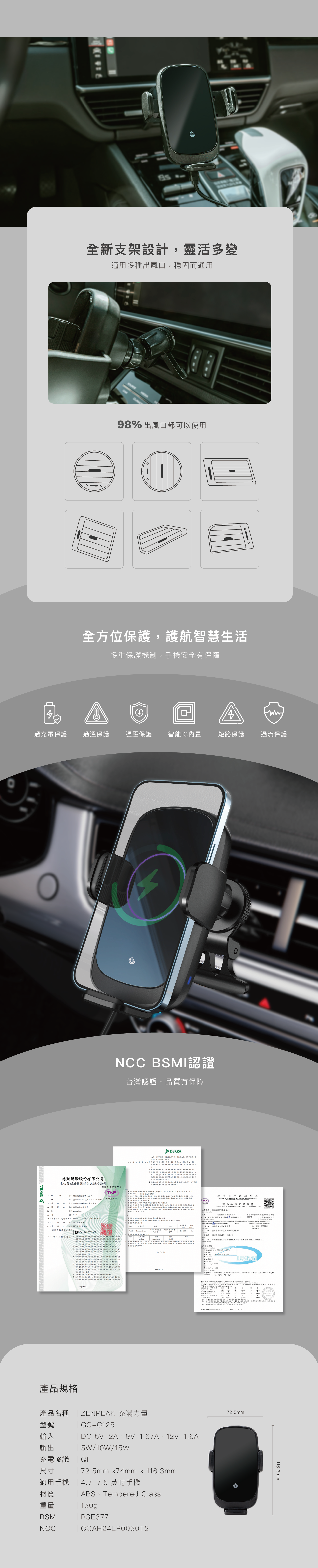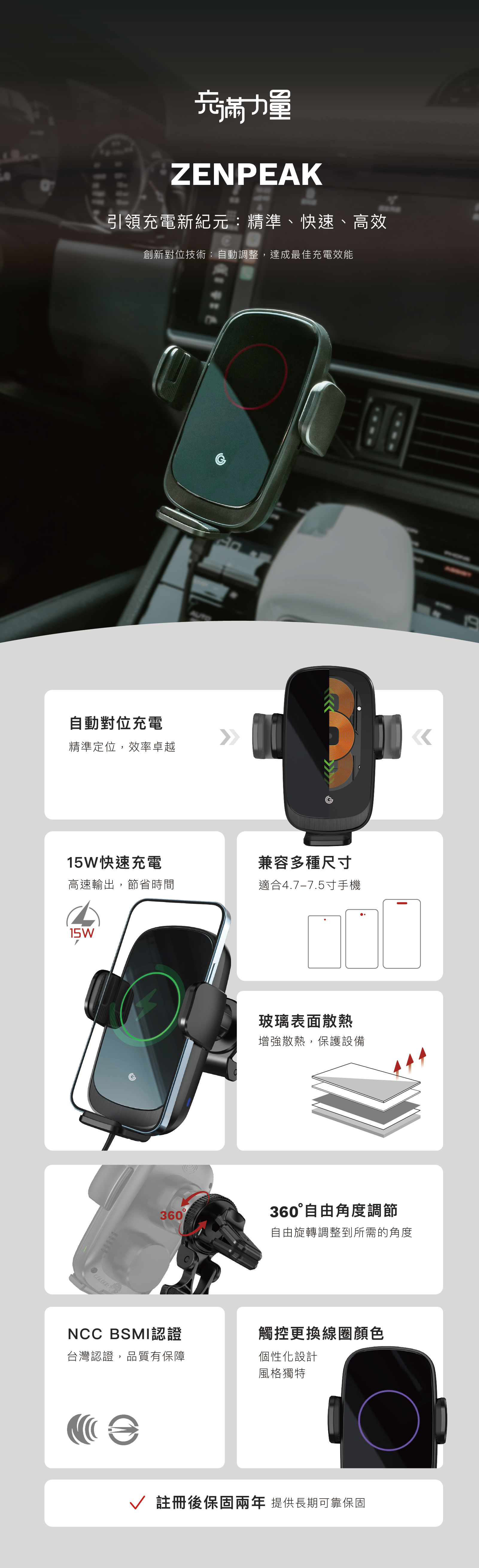 充滿力量 ZENPEAK 15W 無線充電手機支架採用最新的自動偵測技術,可以迅速識別您的手機並自動調整,以最佳位置緊密夾持。這個支架不僅提供穩固的支撐,保護您的手機不受顛簸的影響,同時還能快速無線充電,讓您在駕駛過程中的手機電量保持充足。其獨特的設計與高效的充電能力,使其成為駕駛者的理想選擇。